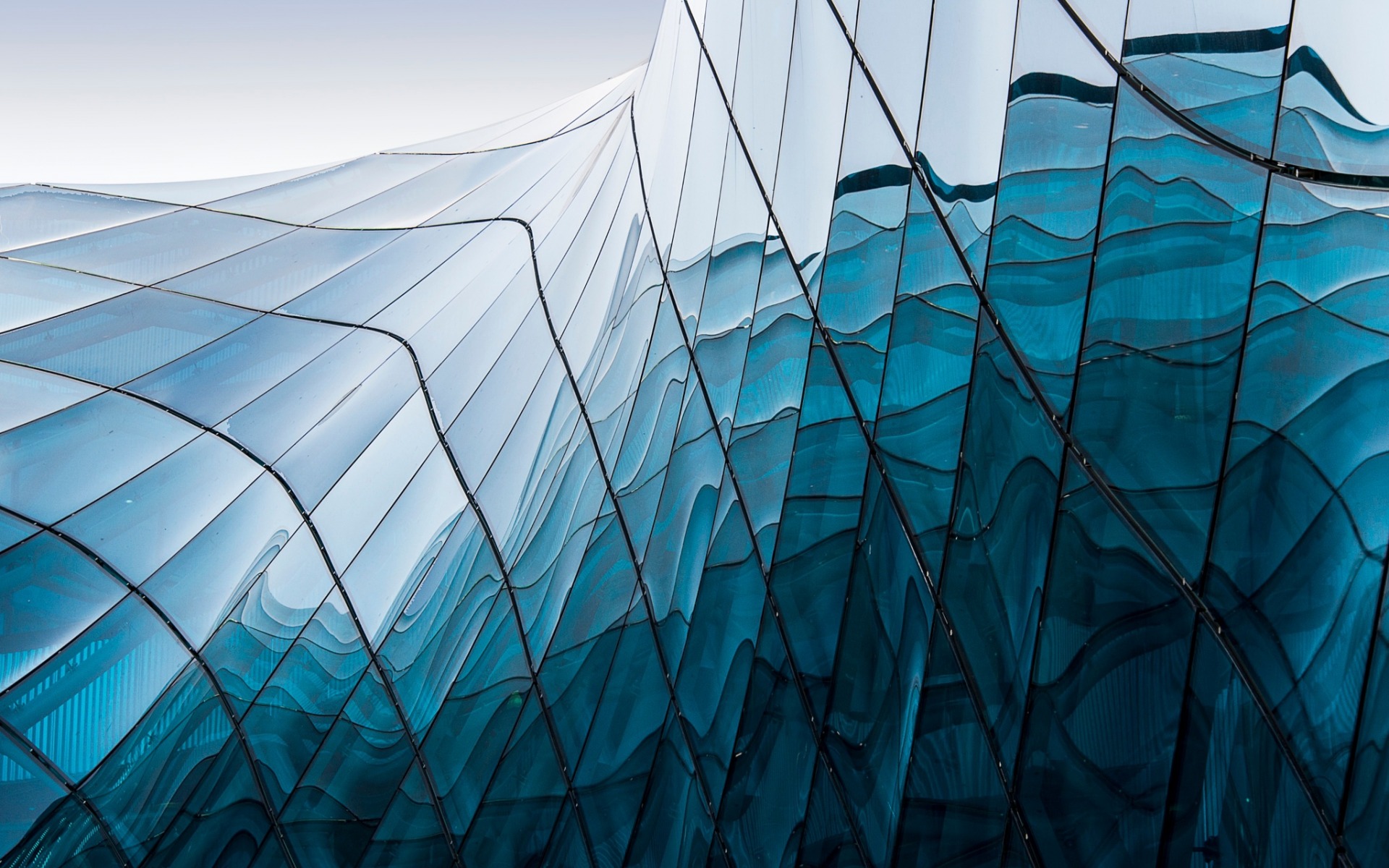 Description: A building with a very large glass facade on it's side and a clock on the side of it.