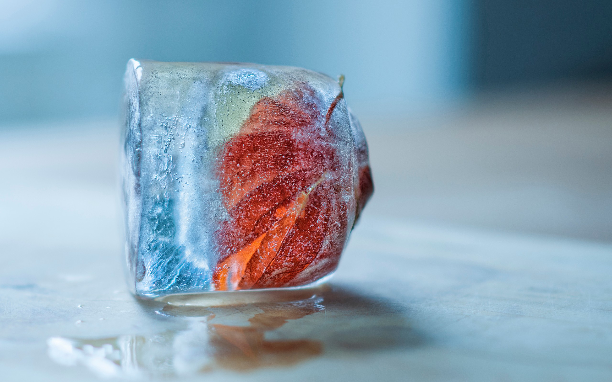 Description: A glass with some ice and some fruit inside of it on a table top with water droplets on it.