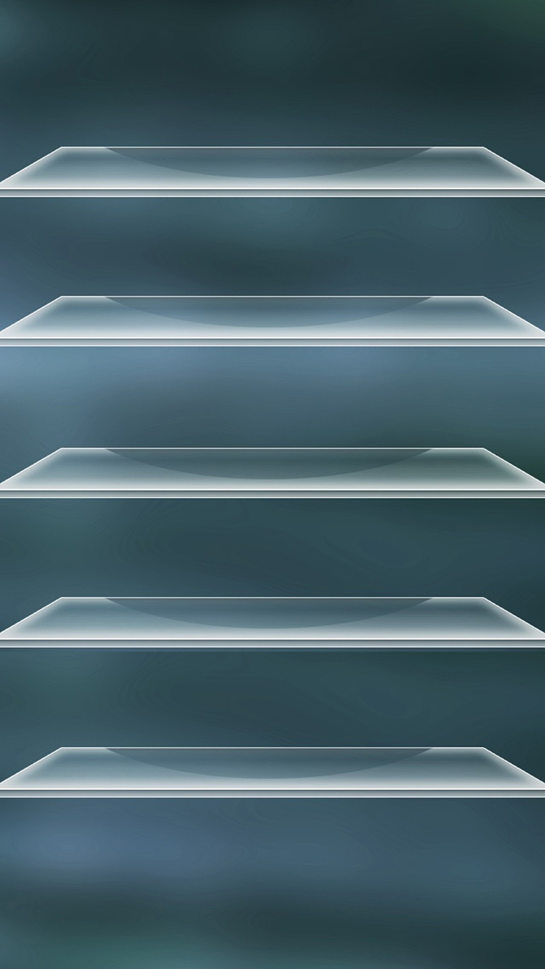 Description: A row of glass shelves with a black background and a blue background with a white line on the bottom.