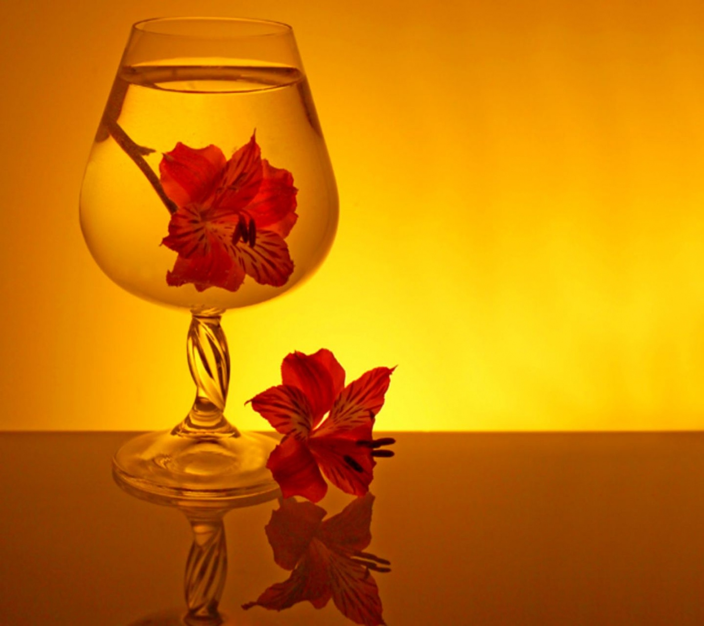 Description: A glass of water with a flower in it on a table with a yellow background and a yellow light.