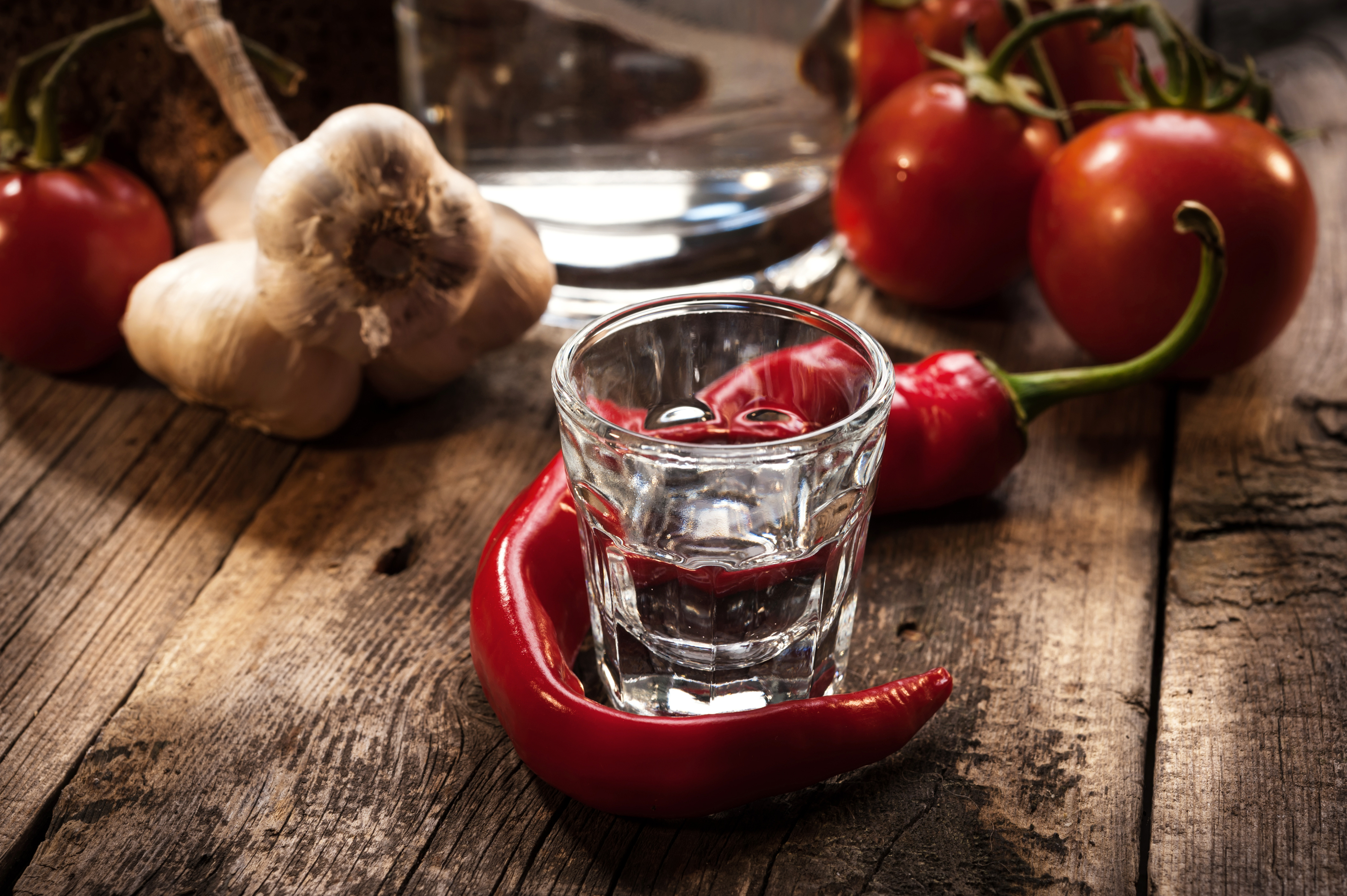 Description: A glass of water with some red peppers and garlic on the side of it and a bowl of garlic and garlic on the side.