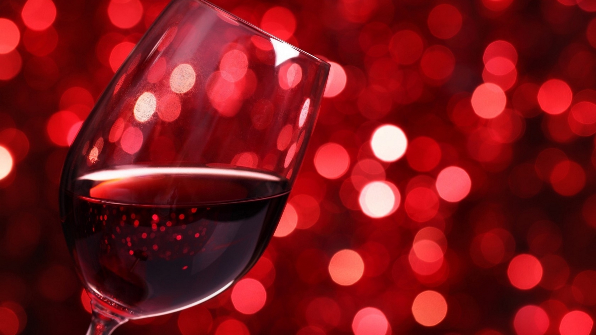 Description: A glass of wine is sitting on a table with a red background and boke of lights behind it.