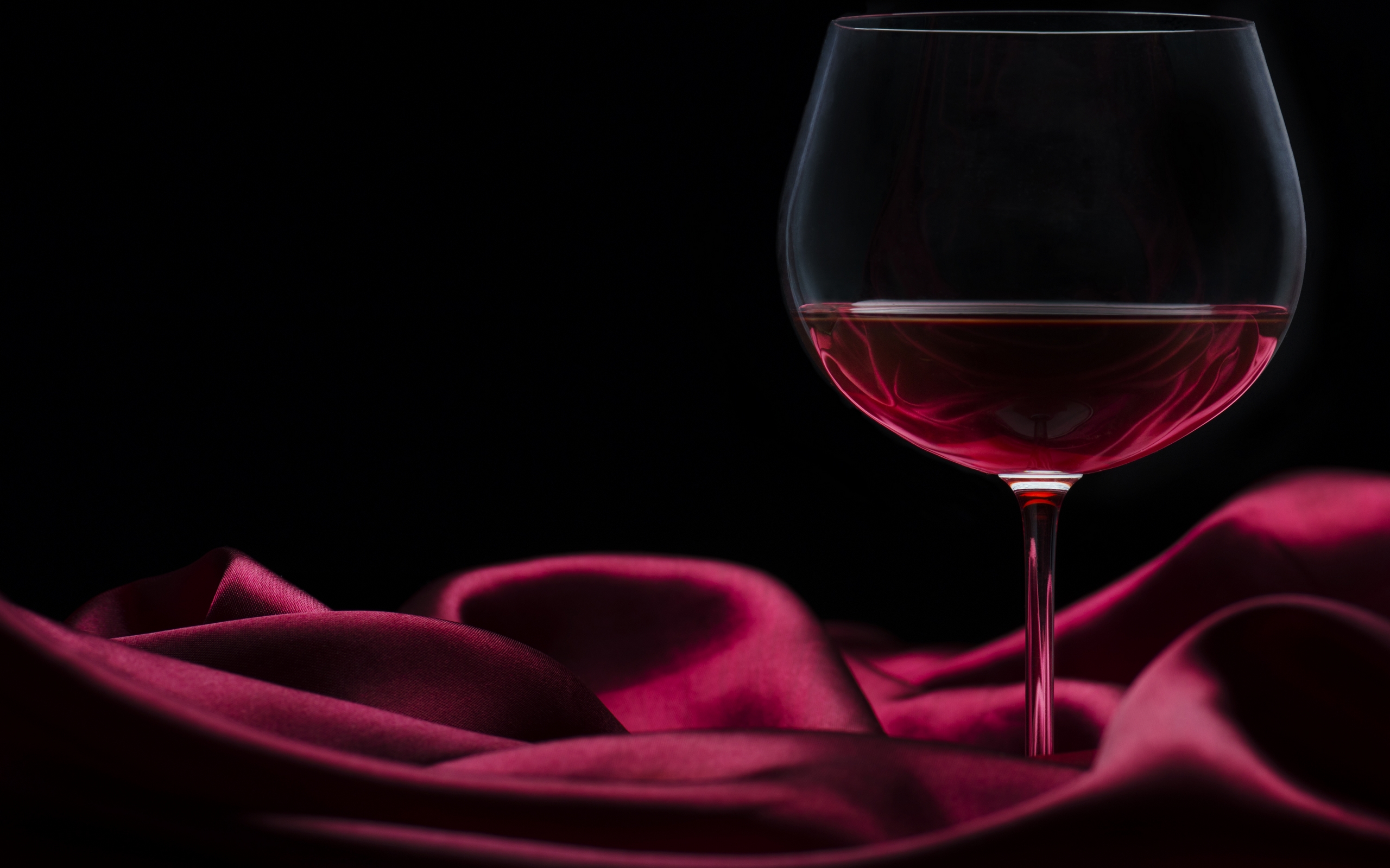Description: A glass of wine sitting on a table with a cloth on it's side and a black background.