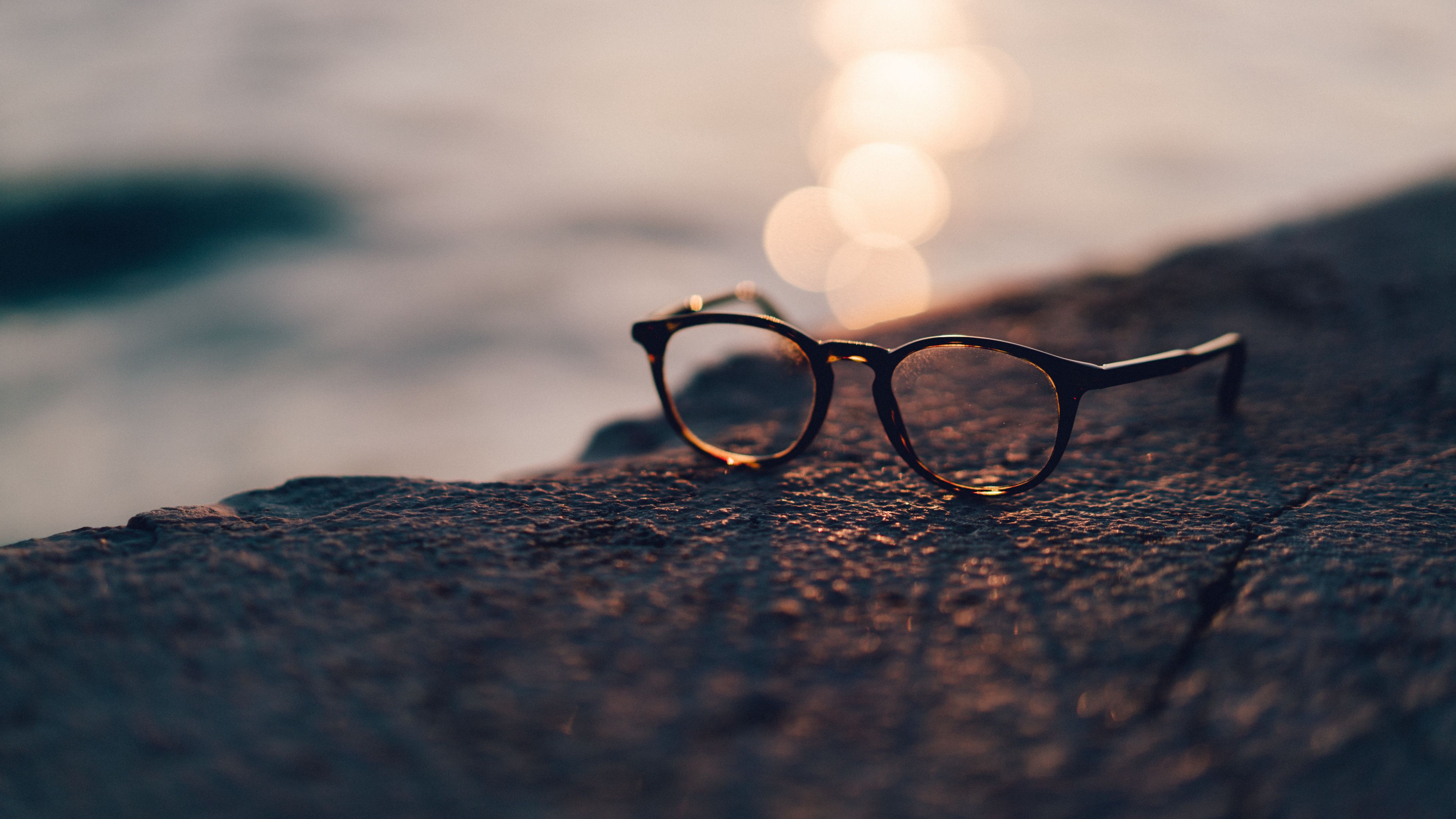 Description: A pair of glasses sitting on a rock near the ocean with the sun shining through the lens and reflecting the water.