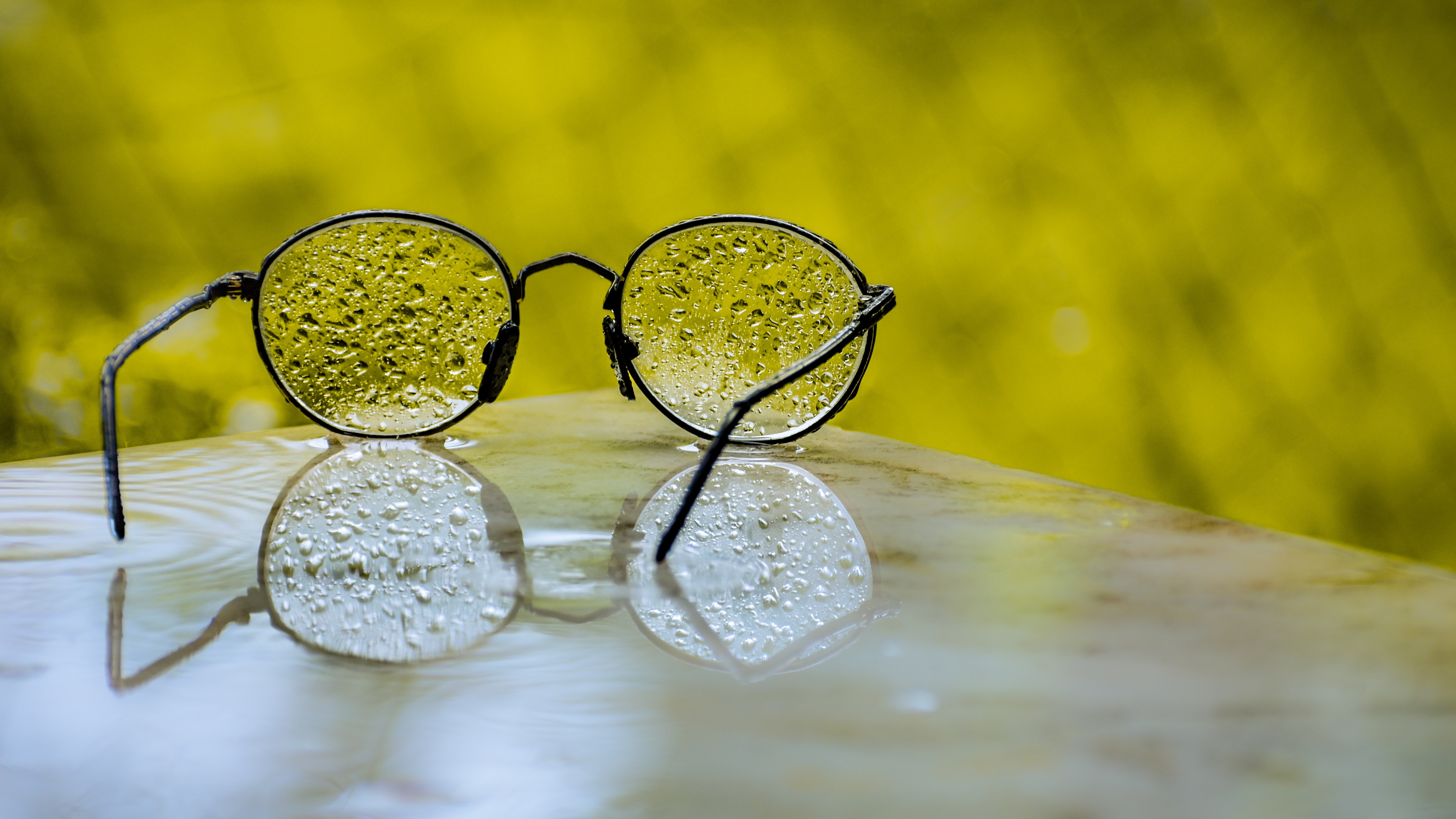 Description: A pair of glasses sitting on top of a wooden table next to a yellow background with water droplets on the lens.