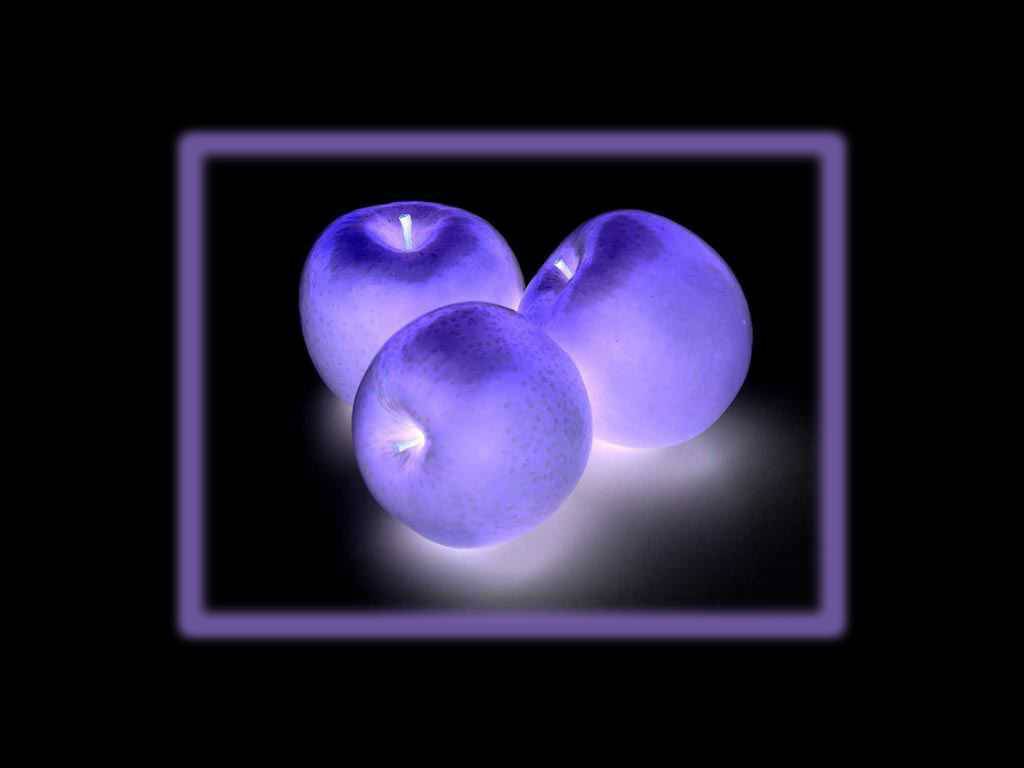 Description: Three apples are glowing in the dark with a square frame around them and a purple light shining on them.
