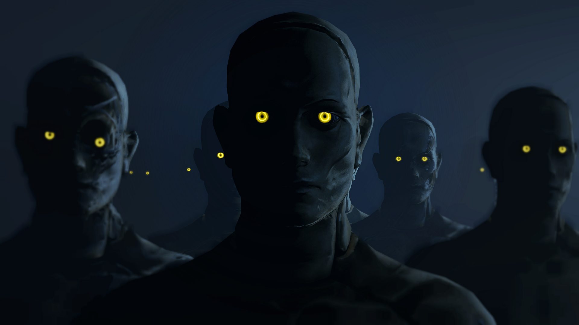 Description: A group of people with glowing eyes in a dark room with yellow eyes on their faces and in the dark.