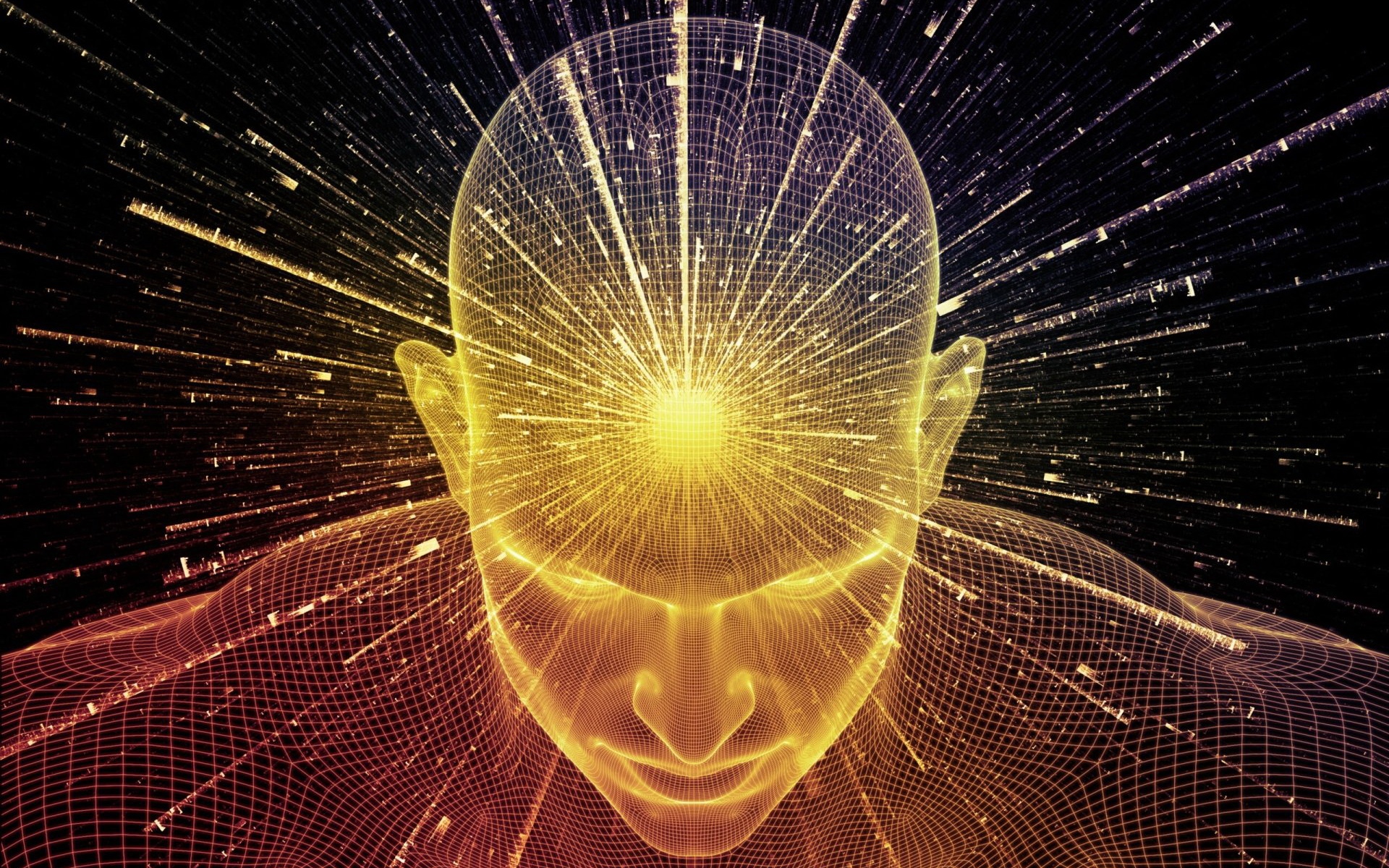 Description: A man's head with a glowing light in the middle of it and a line of lines in the middle of the head.