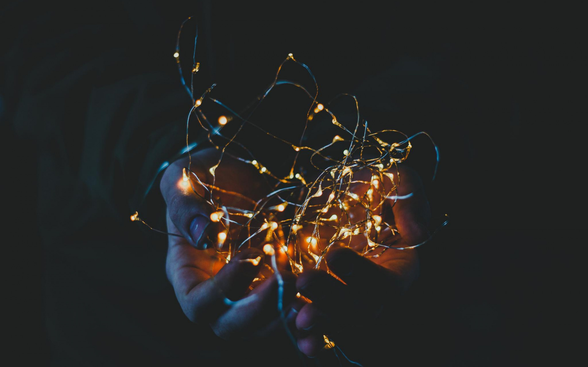 Description: A person holding a string of lights in their hands with a dark background and a black background with a person holding a string of lights.