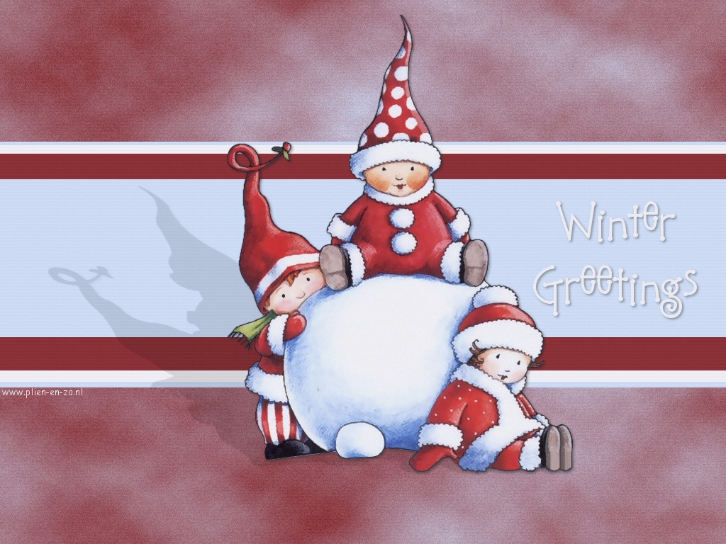 Description: A painting of a group of gnomes sitting on a sign with a santa clause hat on it's head.