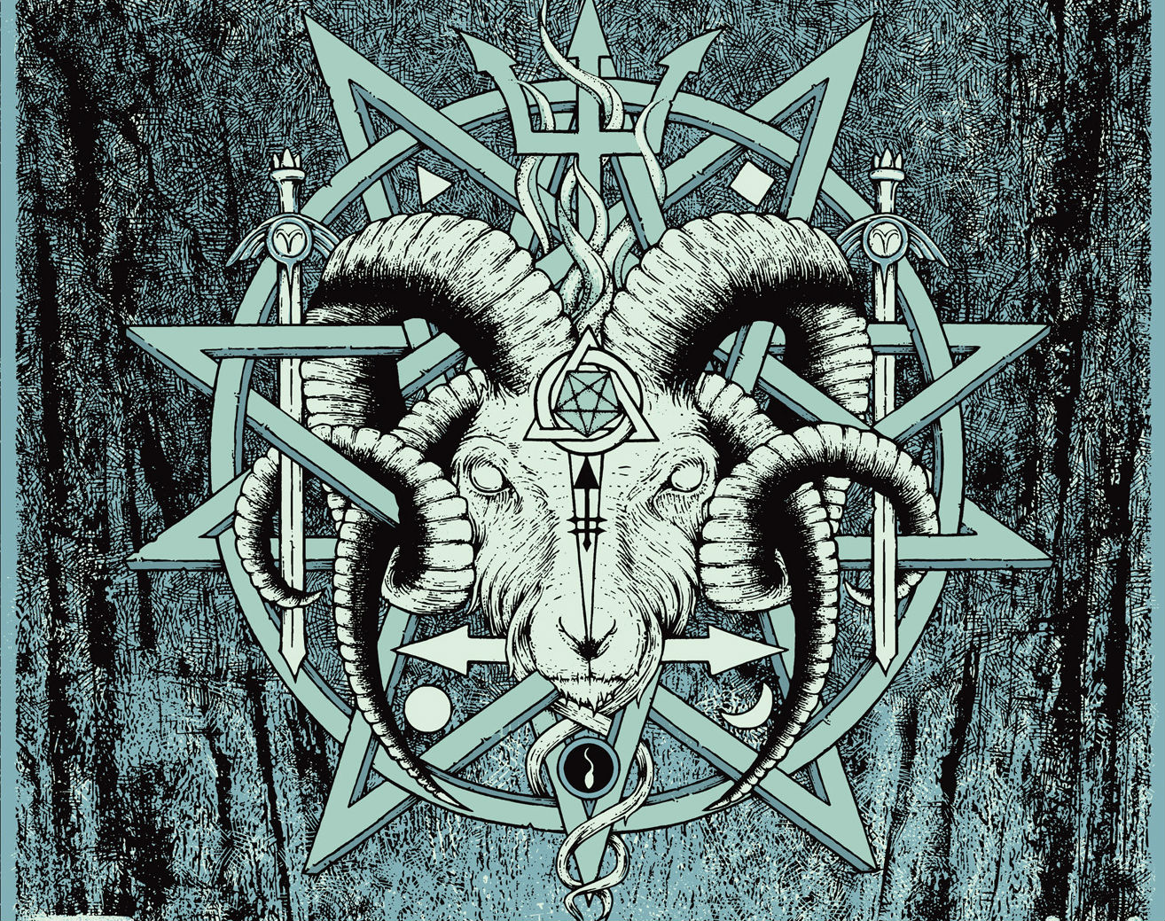 Description: A goat head with a pentagramus pentagramus on it's forehead and a pentagramus on its forehead.