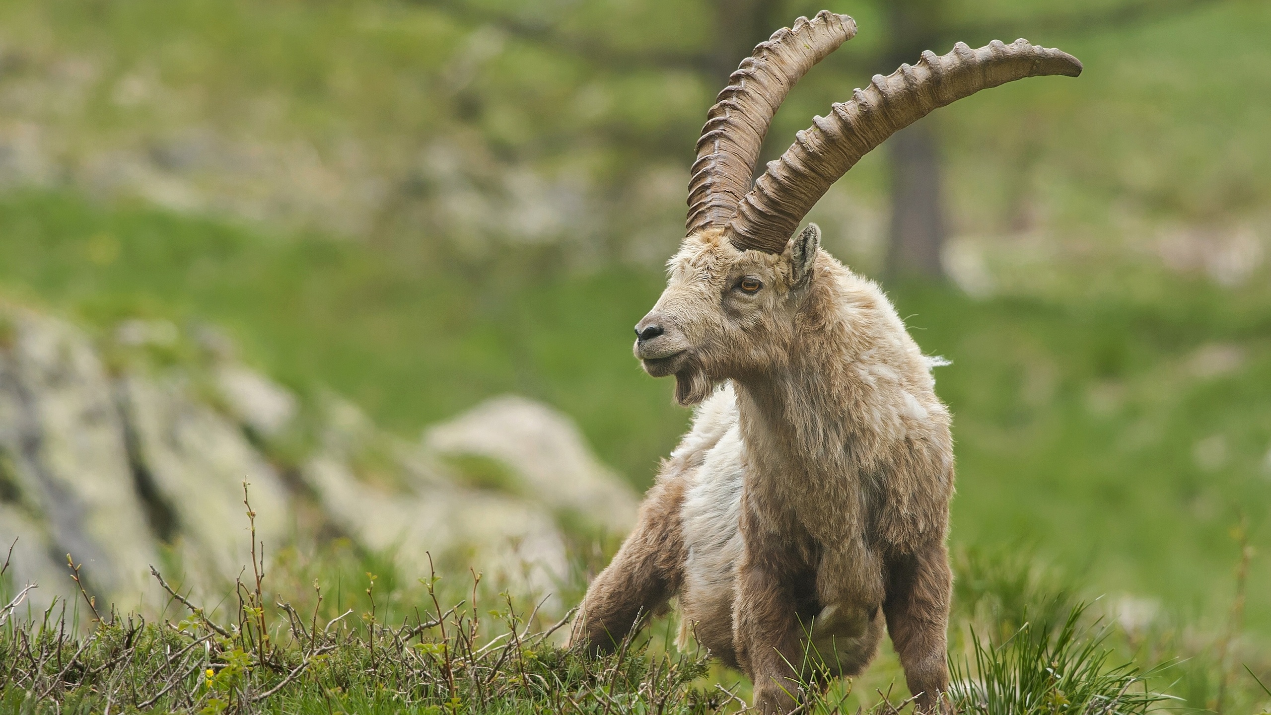 Description: A goat with long horns standing in a field of grass and rocks.