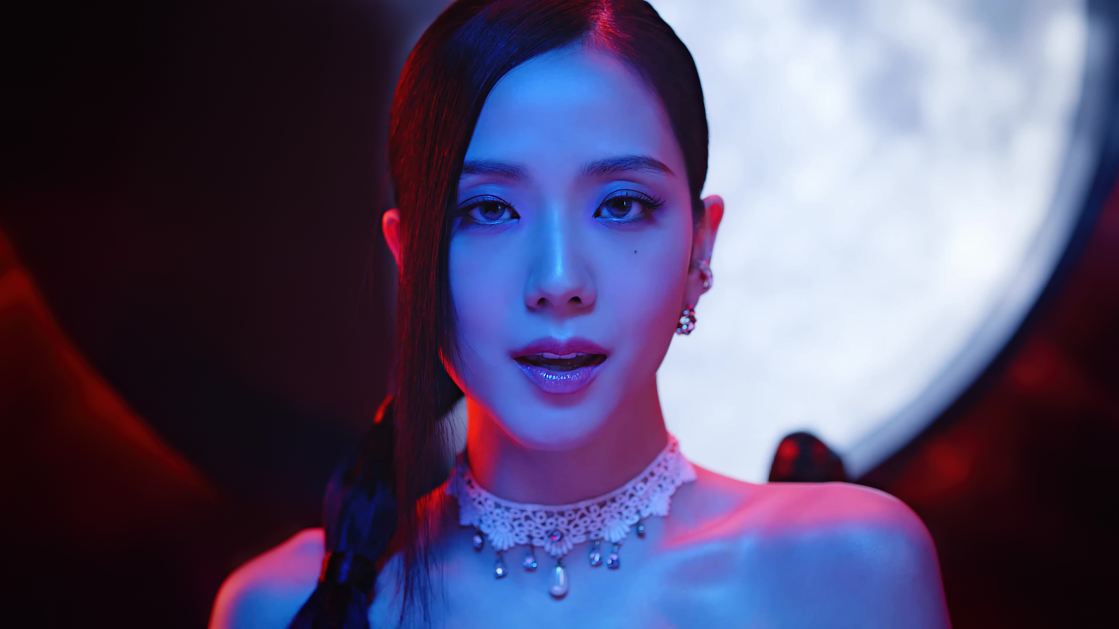Description: A woman in a white dress with a necklace and a necklace on her neck and a moon in the background.