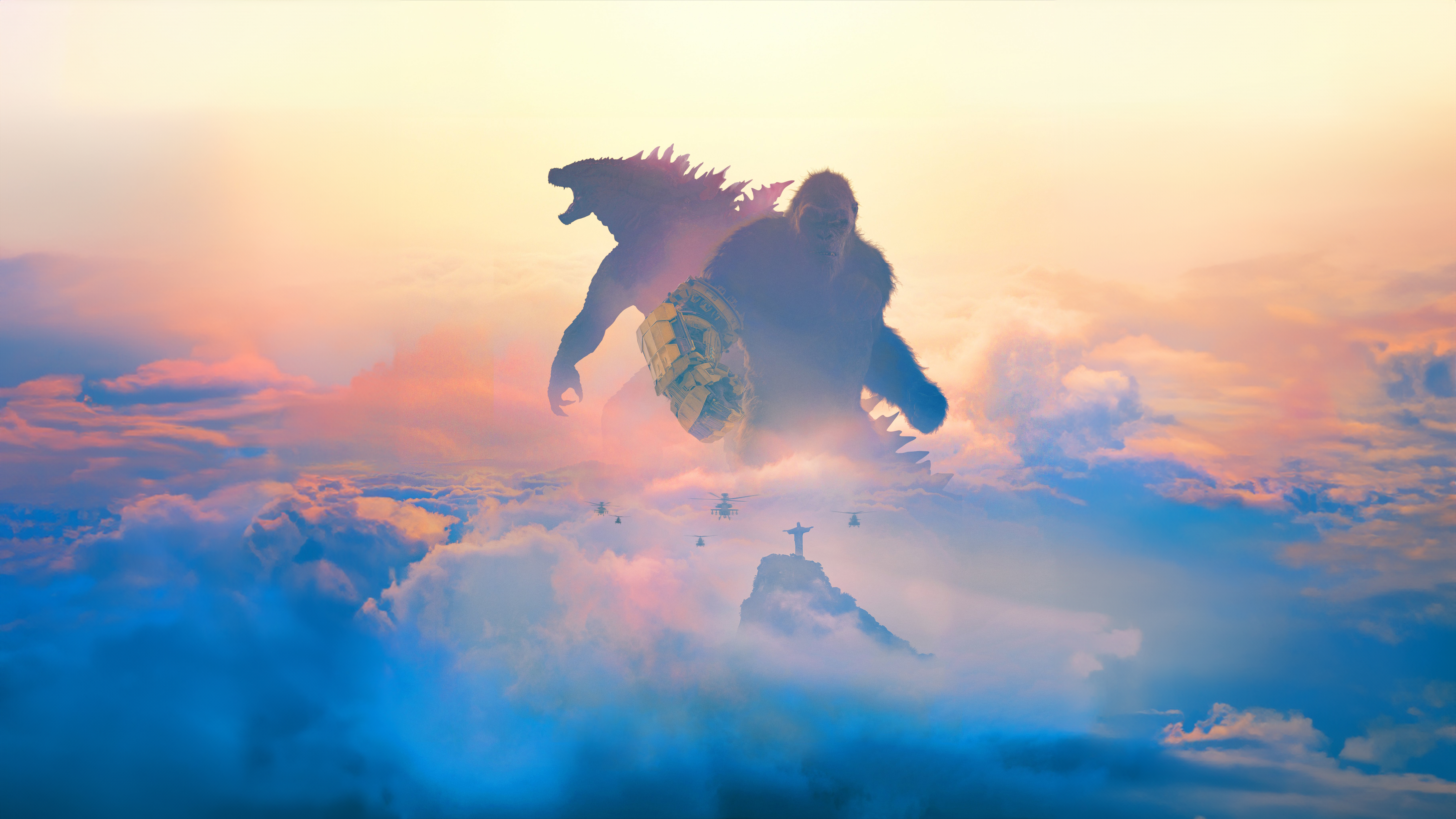 Description: A godzilla is flying through the sky above clouds and mountains with a bird flying above it and a bird on the ground.