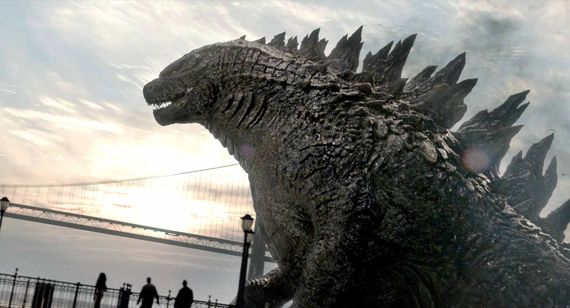 Description: A large godzilla statue in front of a bridge with people walking by it and a bridge in the background.