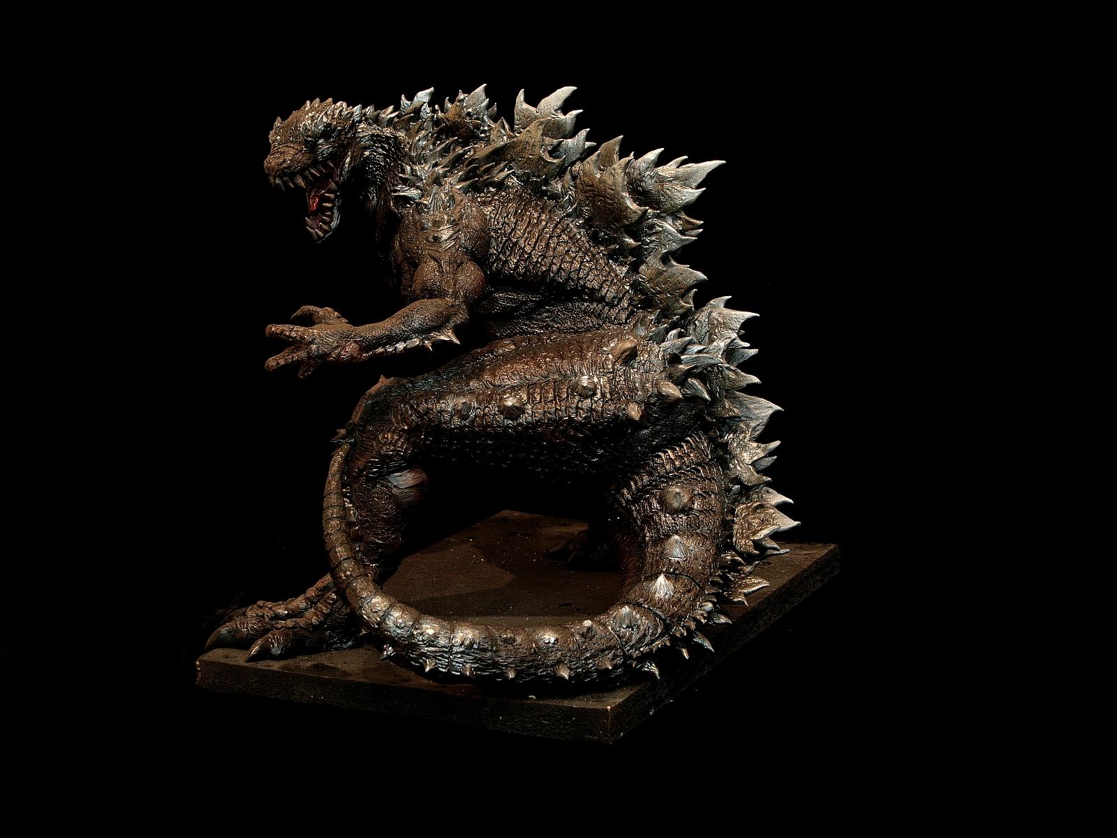 Description: A statue of a godzilla on a wooden base with a black background and a black background behind it.