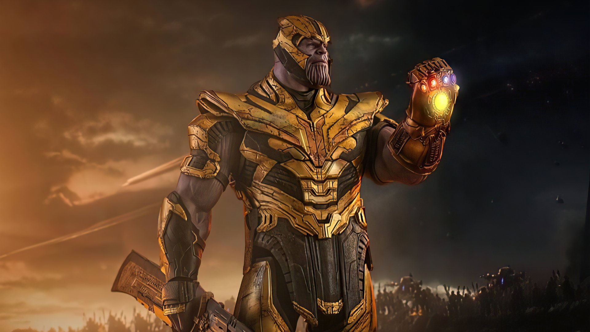 Description: A man in a gold armor holding a glowing object in his hand and a dark sky in the background.