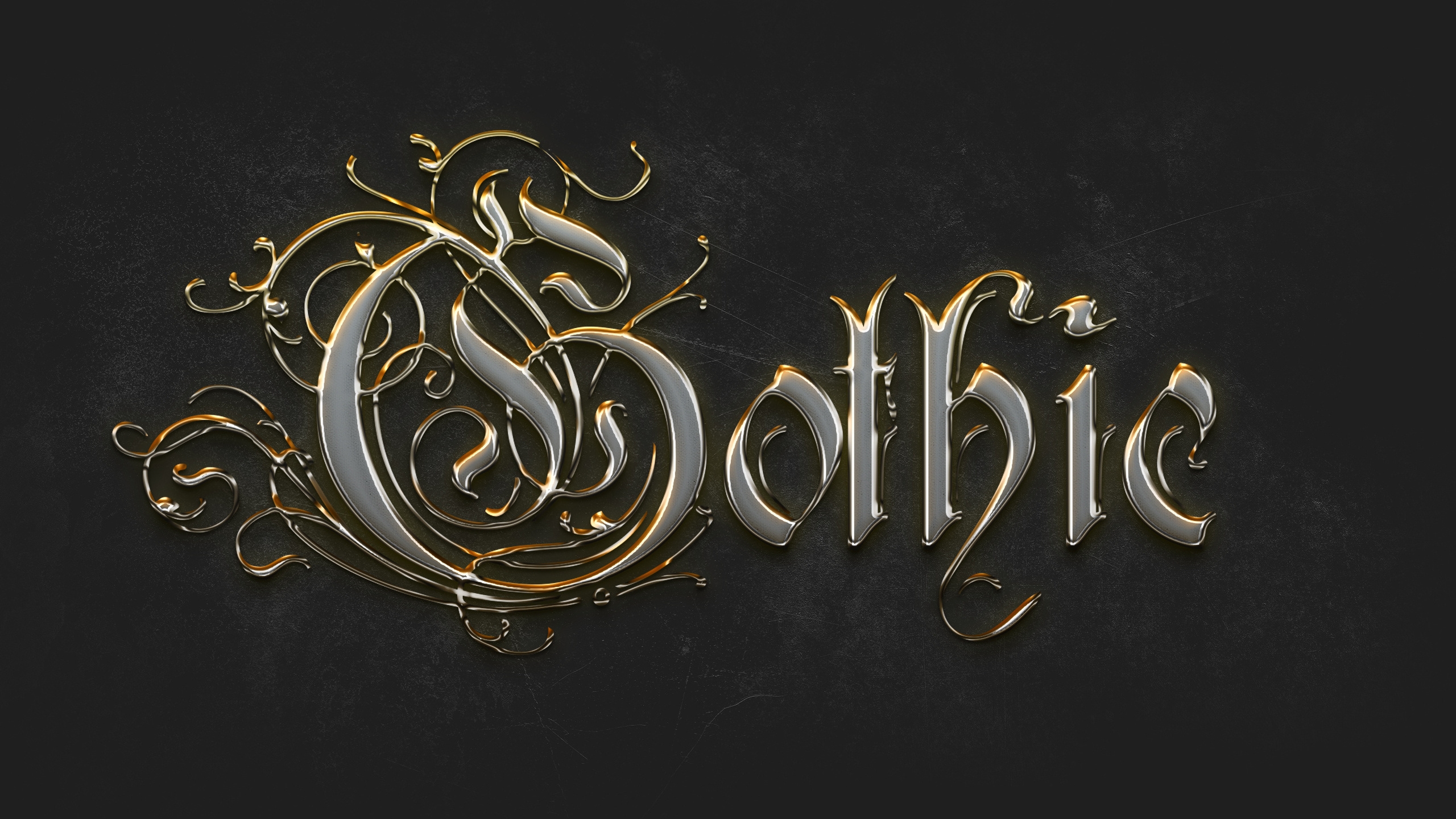 Description: A gold and black logo for gothic on a black background with a swirly design in the middle of the letter.