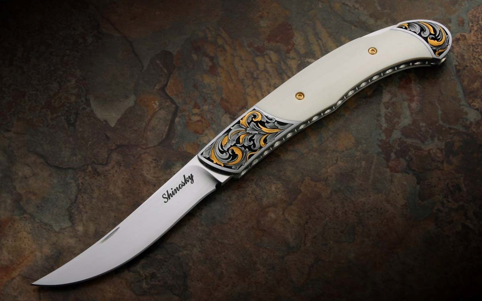 Description: A knife with a gold and black design on it's blade and a black handle on a stone surface.