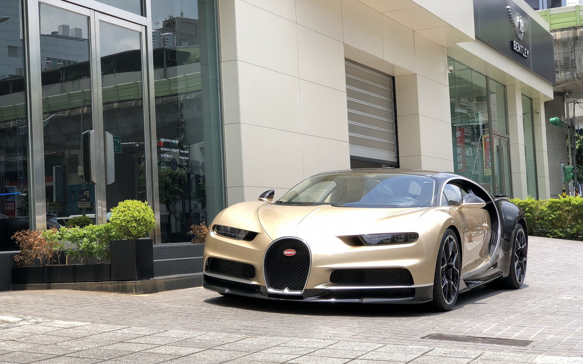 Description: A gold bugatti parked in front of a building with a door open and a car parked in front of it.