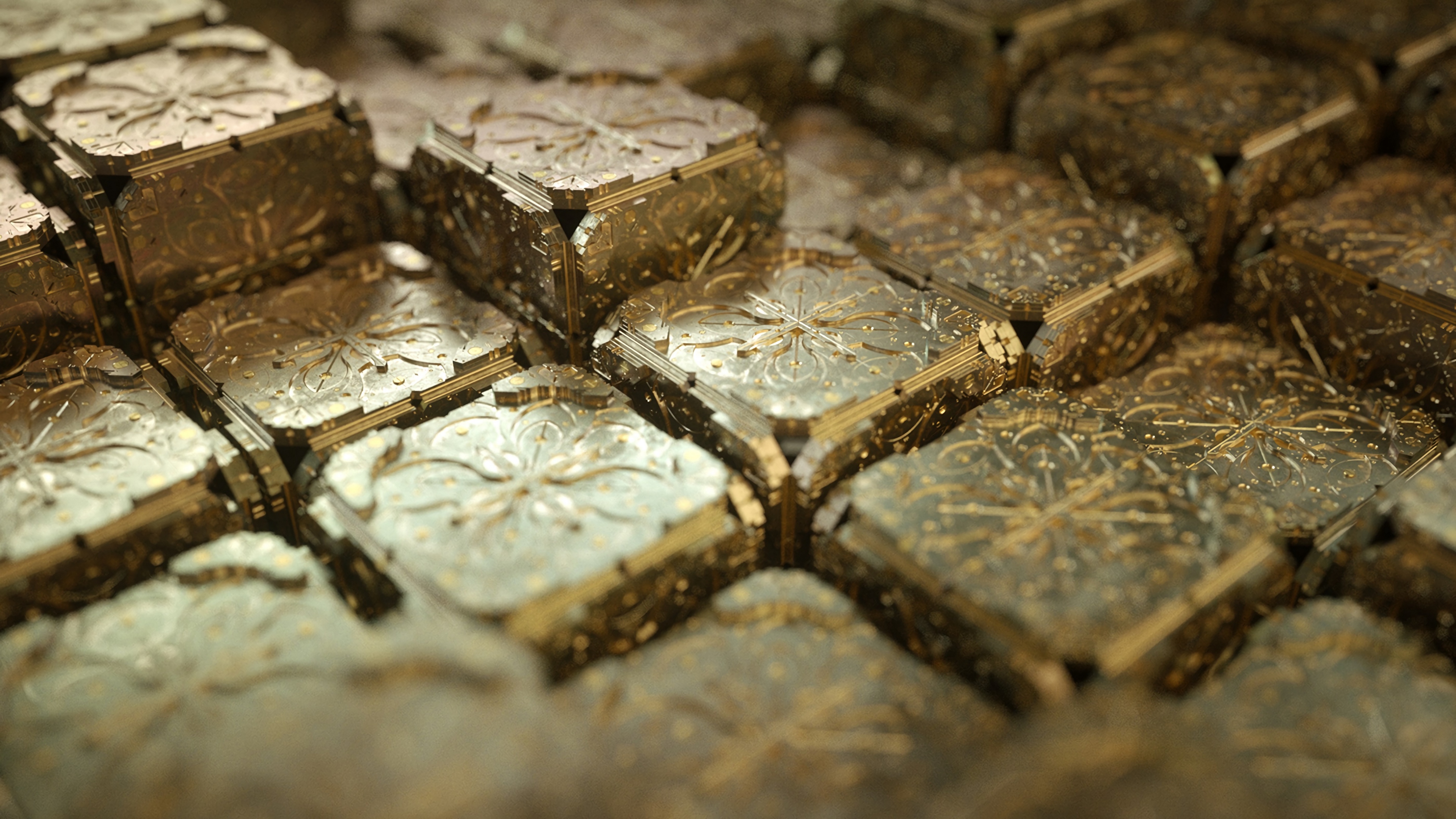 Description: A close up of a bunch of gold and silver squares of metal foil with a pattern of small flowers.
