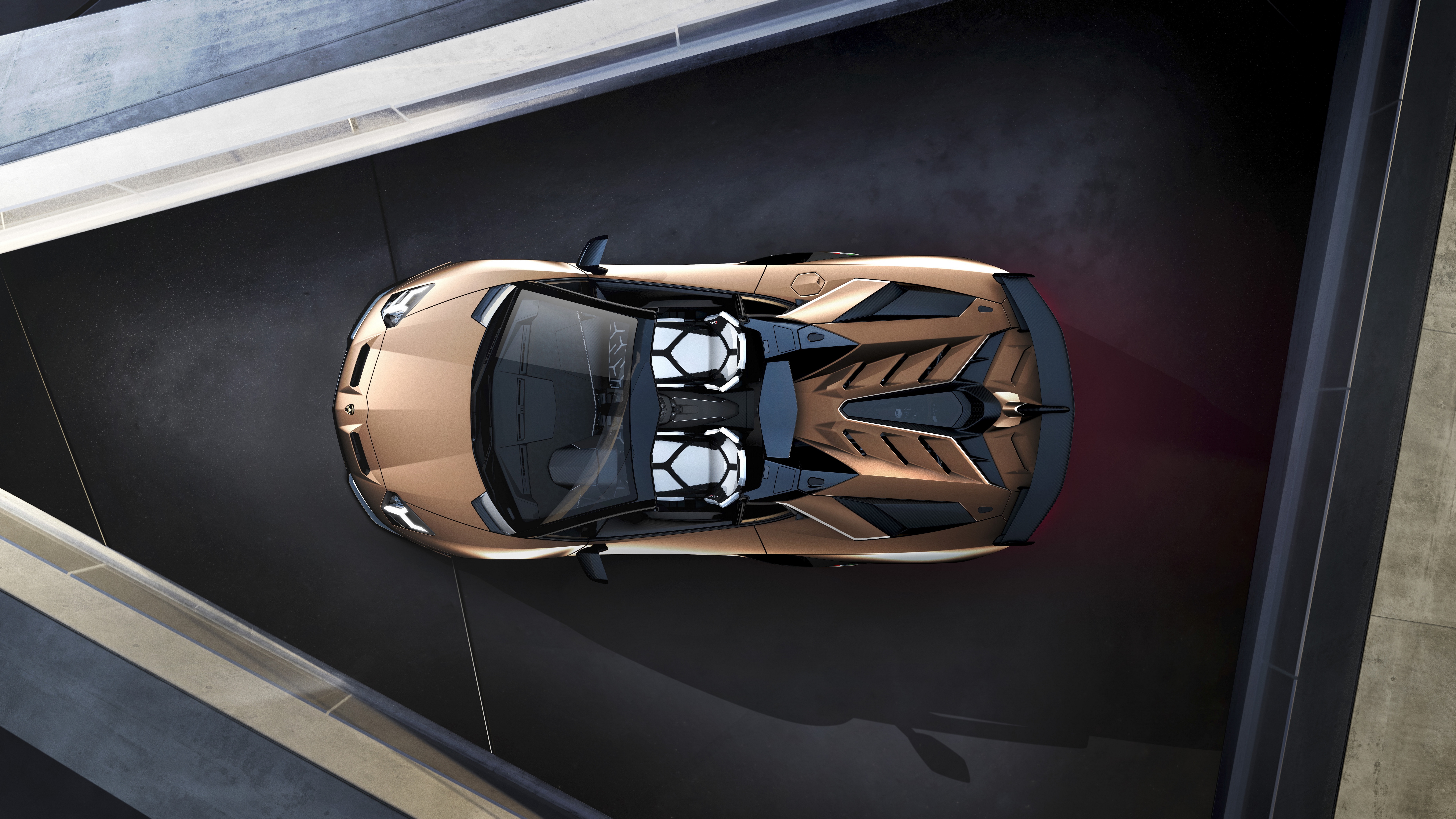Description: A gold sports car is seen from above in a parking garage area with a black floor and a black wall.