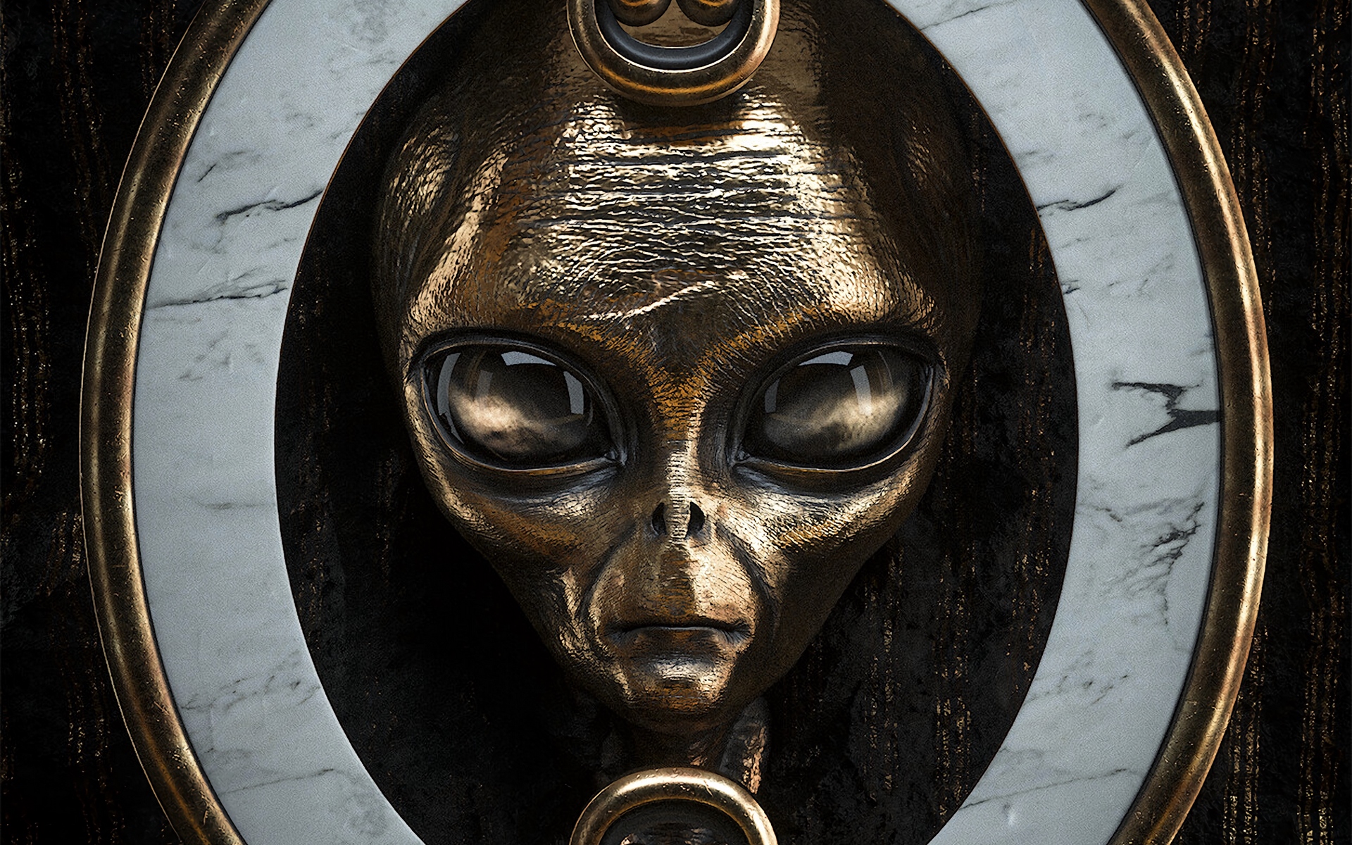 Description: A golden alien head is in a circular frame with a marble background and a gold ring around it's neck.