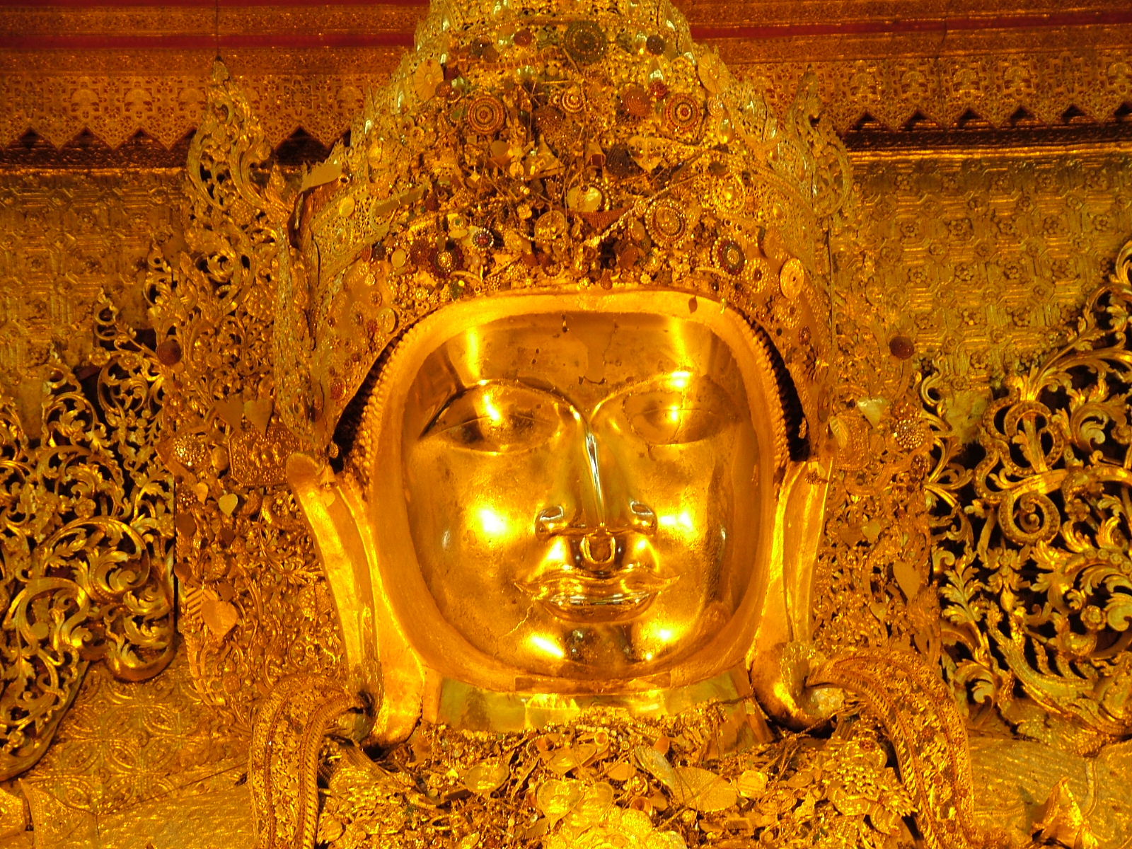 Description: A golden buddha statue with a gold background and a gold background with a gold buddha head in the center.