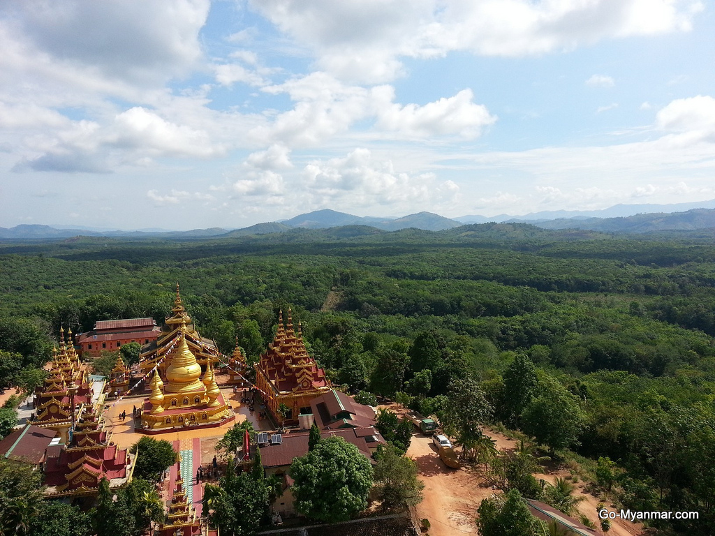 Description: A large golden building sitting in the middle of a lush green forest covered hillside covered in trees and mountains.