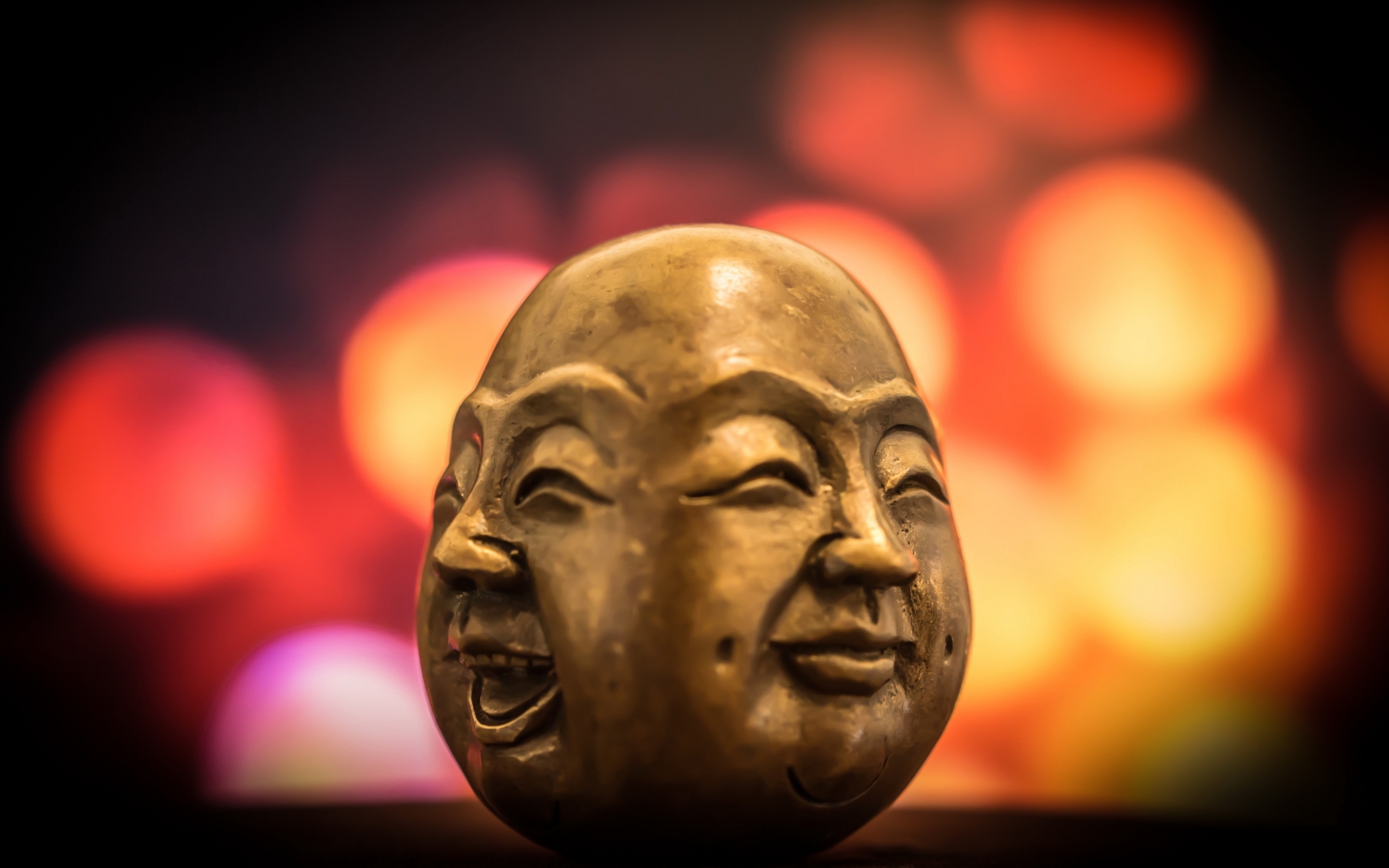 Description: A golden statue of a face with eyes closed and a blurry background of lights in the background is a boke of lights.