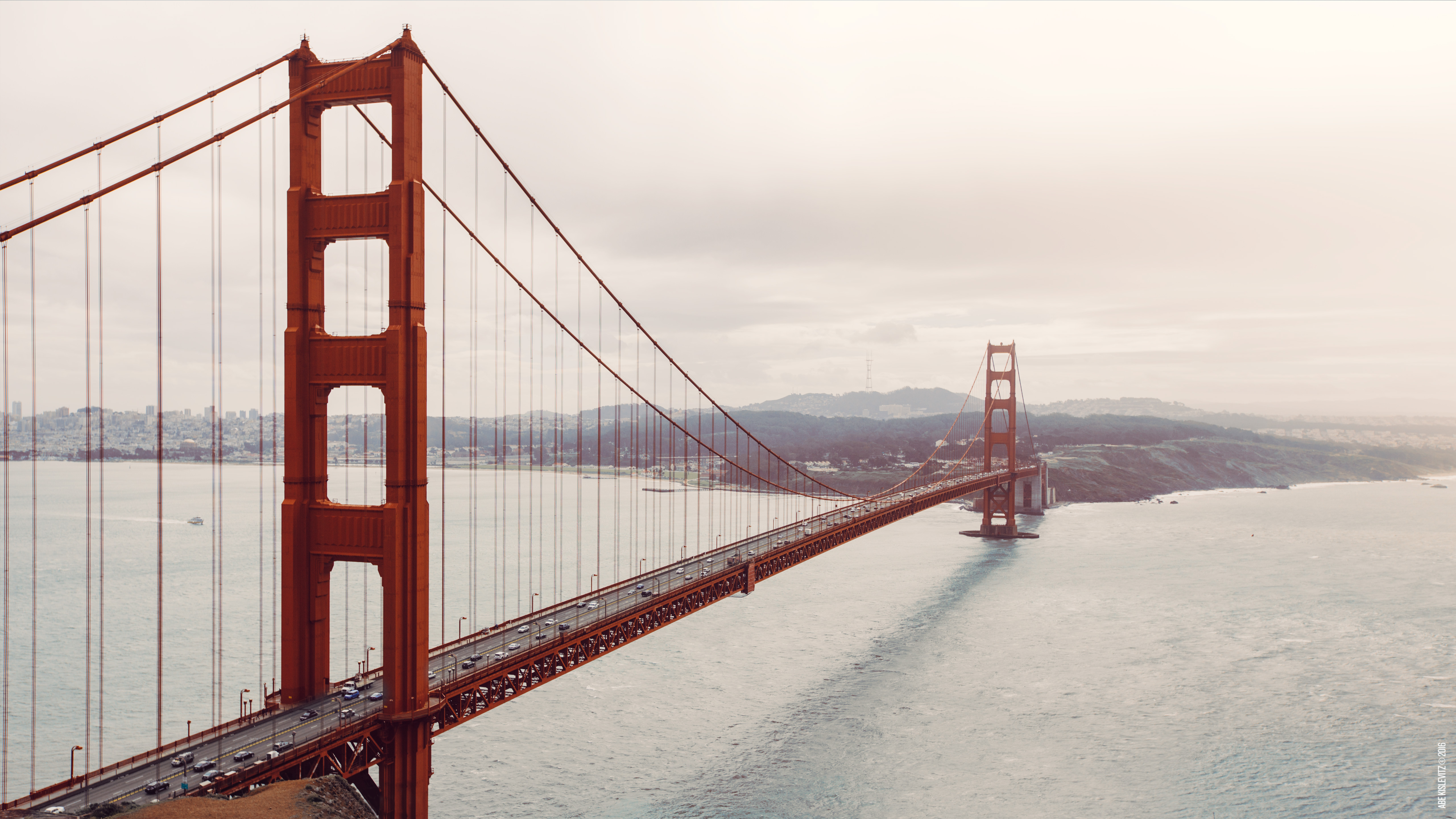Description: A view of the golden gate bridge from a helicopter over the water in san francisco.