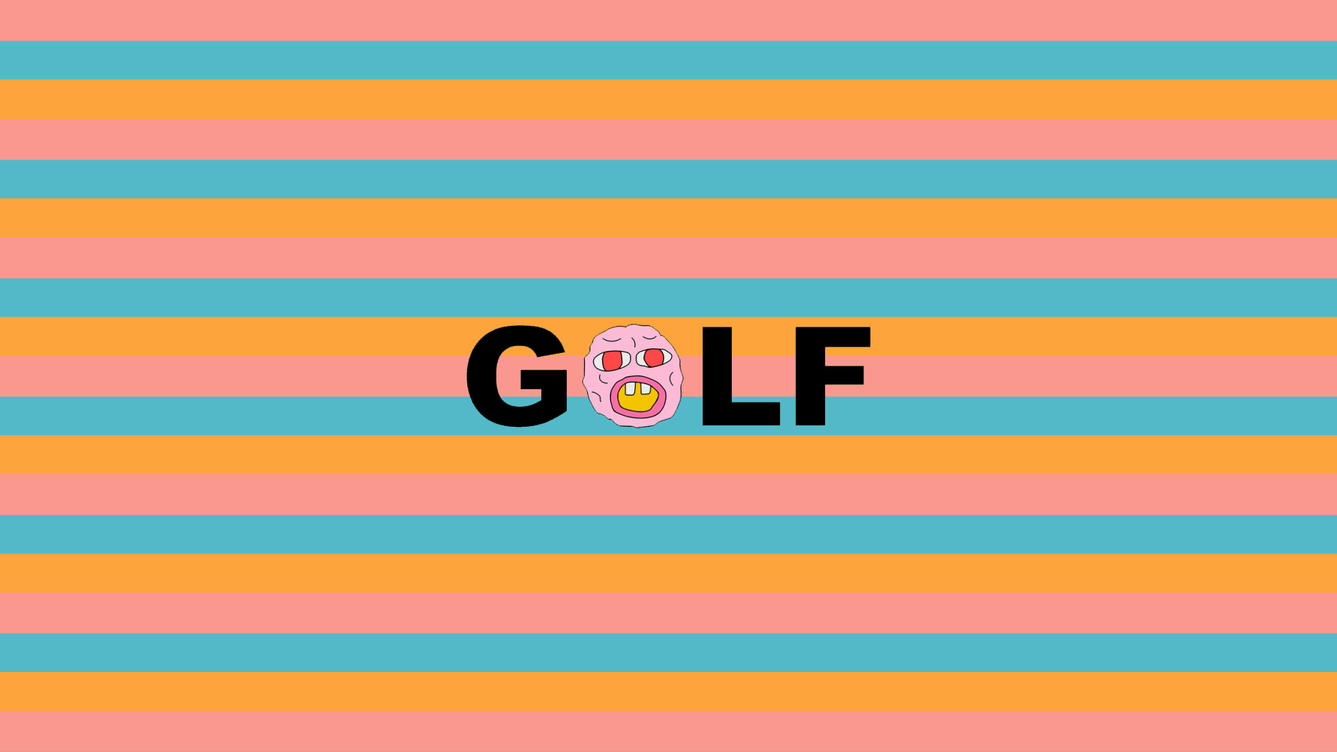 Description: A golf ball with a face on it in front of a striped background with the word golf written in black.