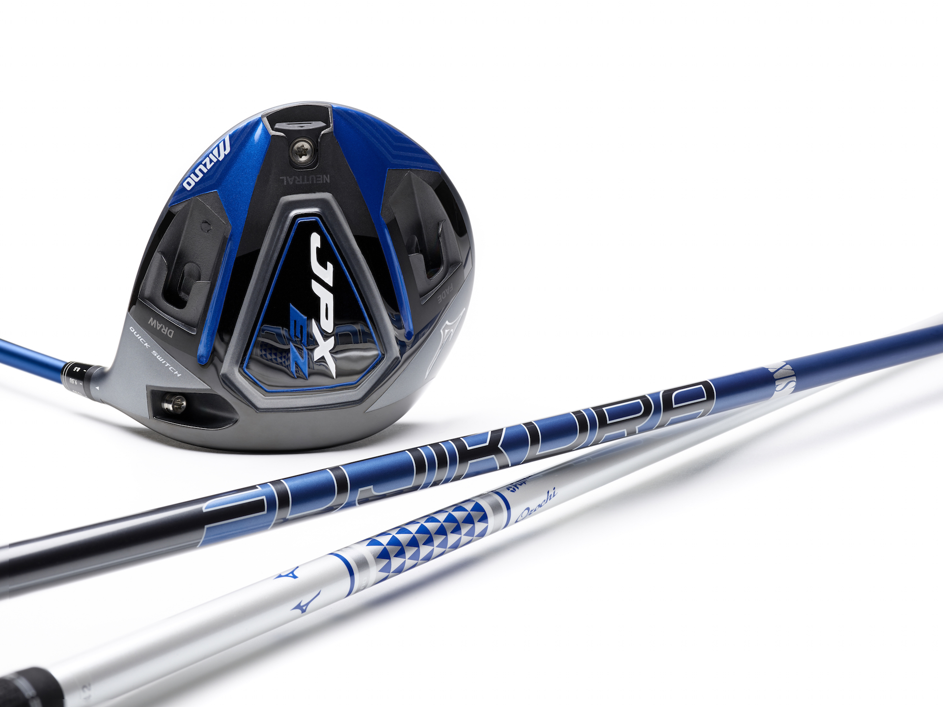Description: A close up of a golf club and a ball on a white surface with a blue stick in the foreground.