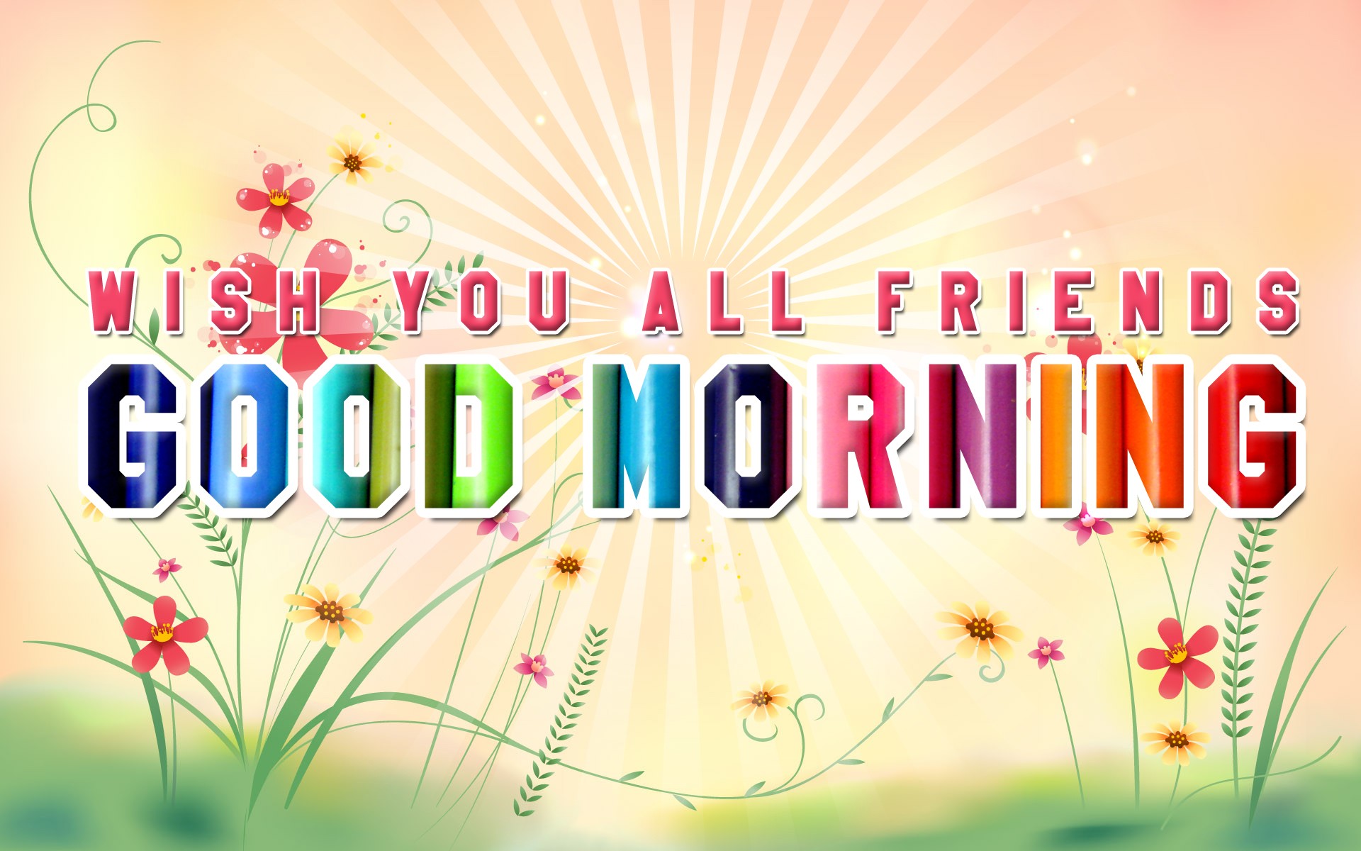 Description: A colorful picture with the words good morning written in it and flowers in the foreground with a sunburst in the background.