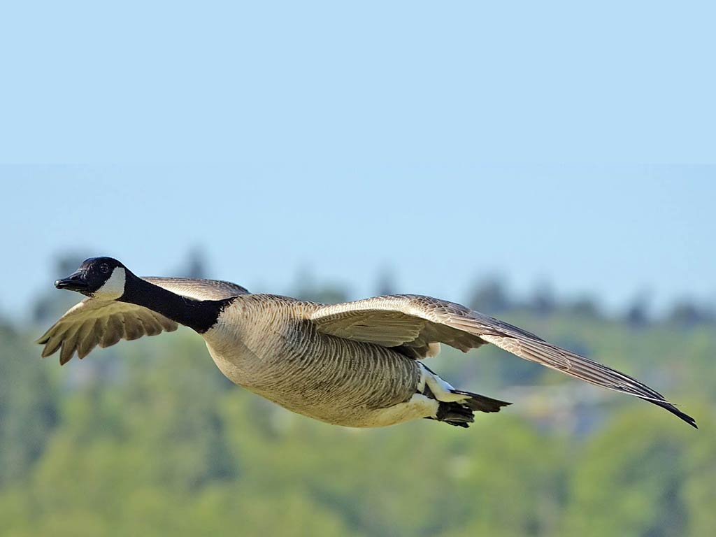Description: A goose flying in the air with trees in the background in the background is a blue sky and a few trees.