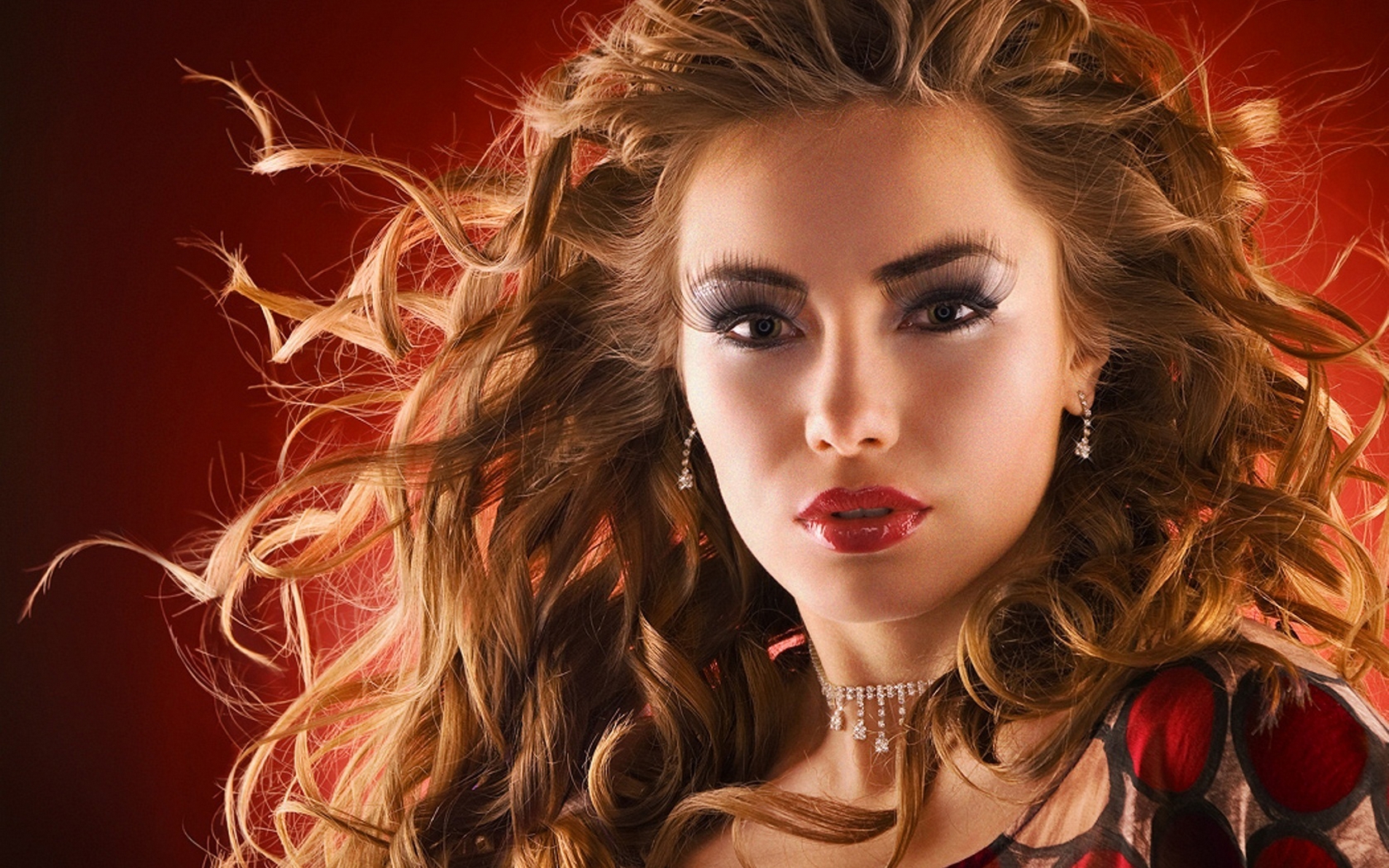 Description: A woman with long hair and a necklace on her neck and a red background with a red background and a red background.