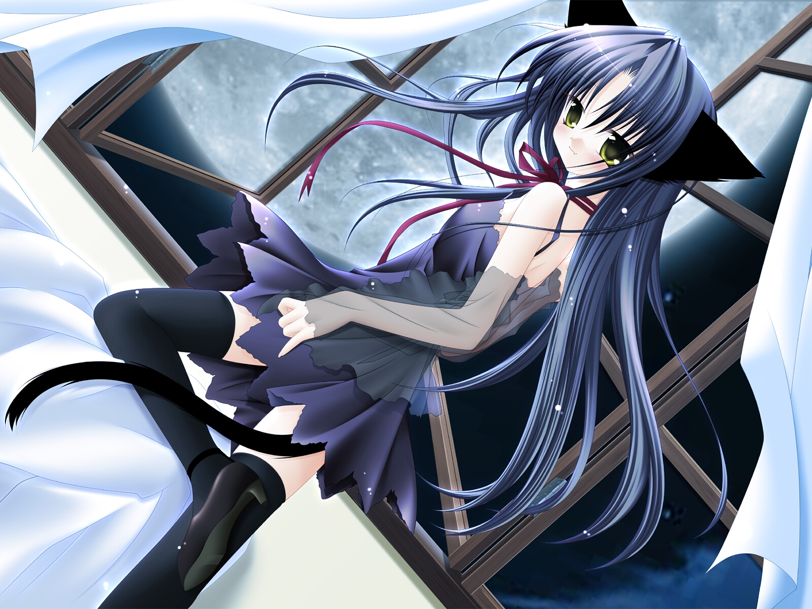 Description: A woman with long hair and a cat ears is sitting on a window sill in front of a full moon.