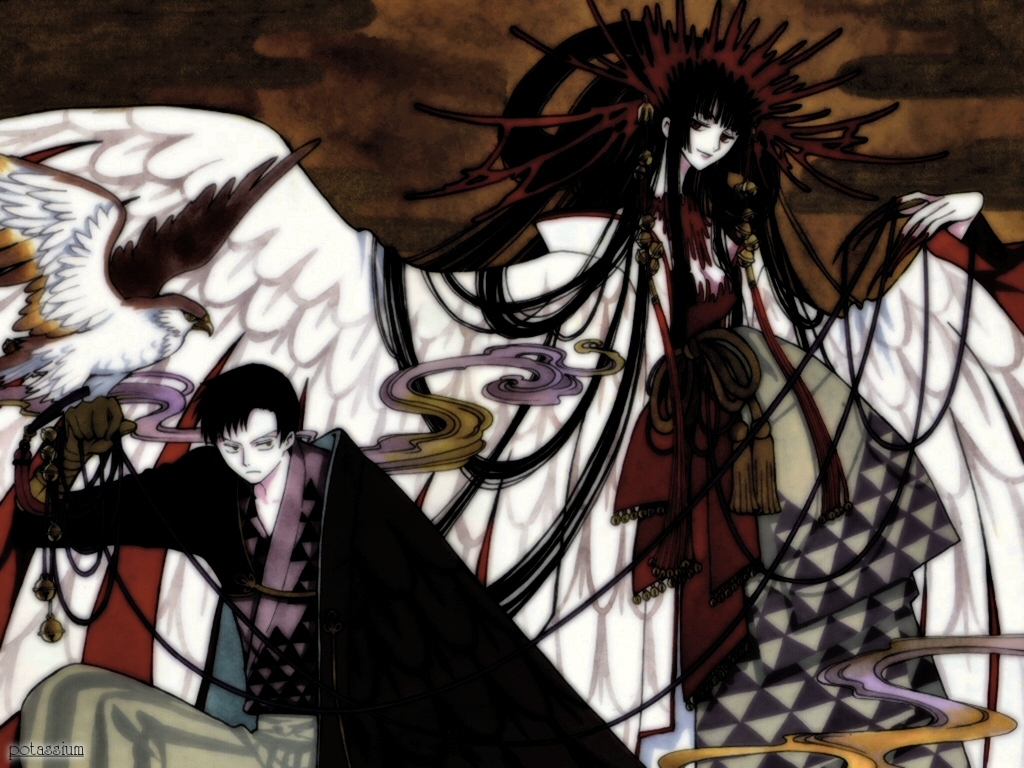 Description: A couple of anime characters sitting next to each other on a chair with a bird flying over them and a bird on the ground.