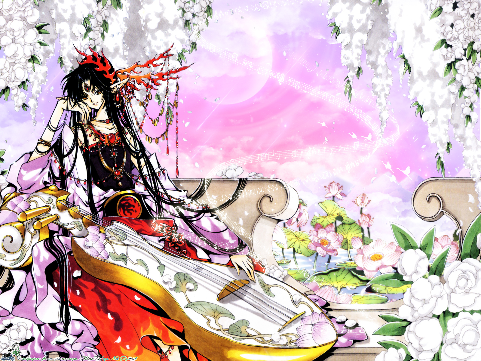 Description: A woman in a dress sitting on a bench with flowers around her and a guitar in her hand.