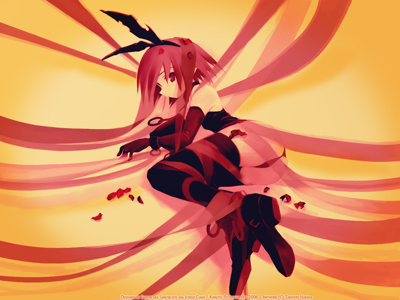Description: A woman with long hair and a black outfit is sitting on a yellow background with red and pink lines.