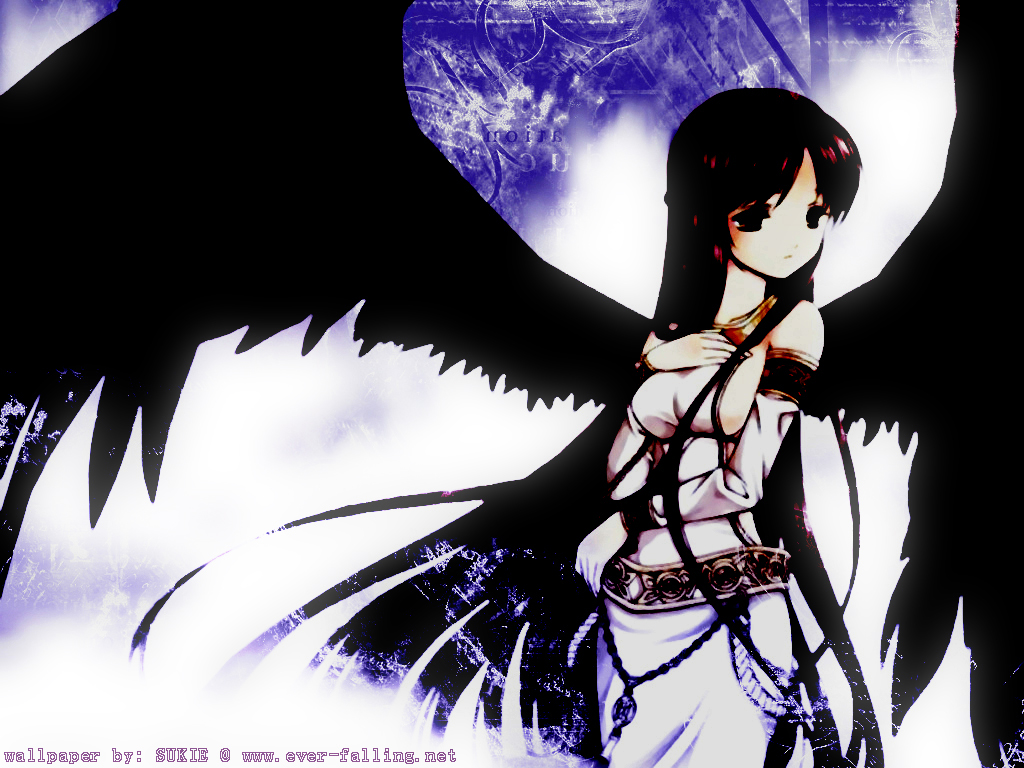 Description: A woman with a black angel wings on her shoulder and a purple background with a black bird on her shoulder.