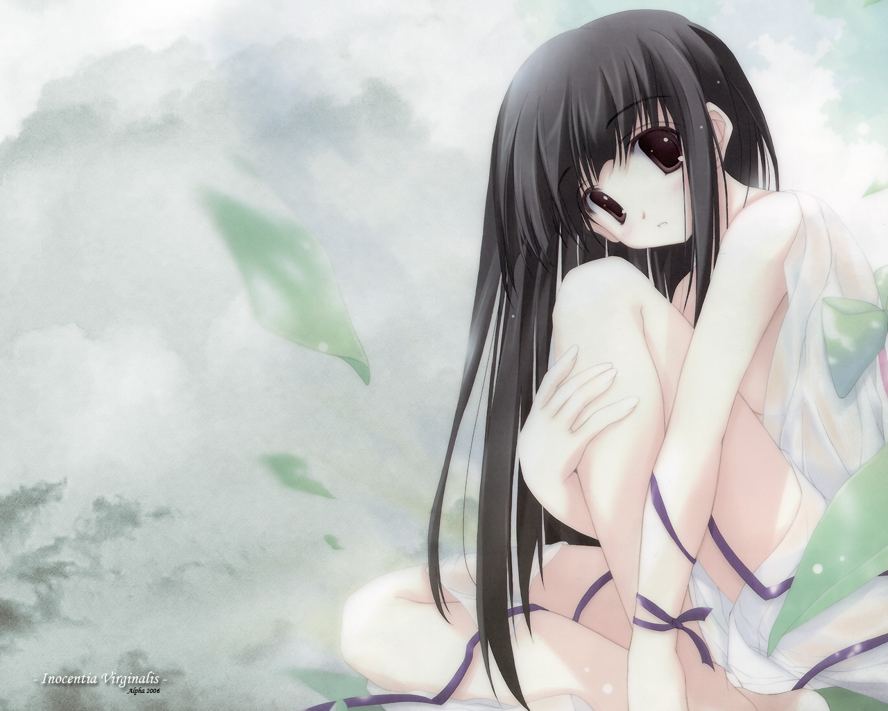 Description: A woman with long hair and a white dress sitting on a cloud covered ground with her arms crossed and her eyes closed.