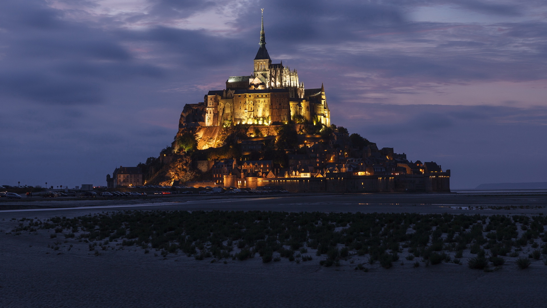 Description: A large castle lit up at night with a sky background and clouds in the background.