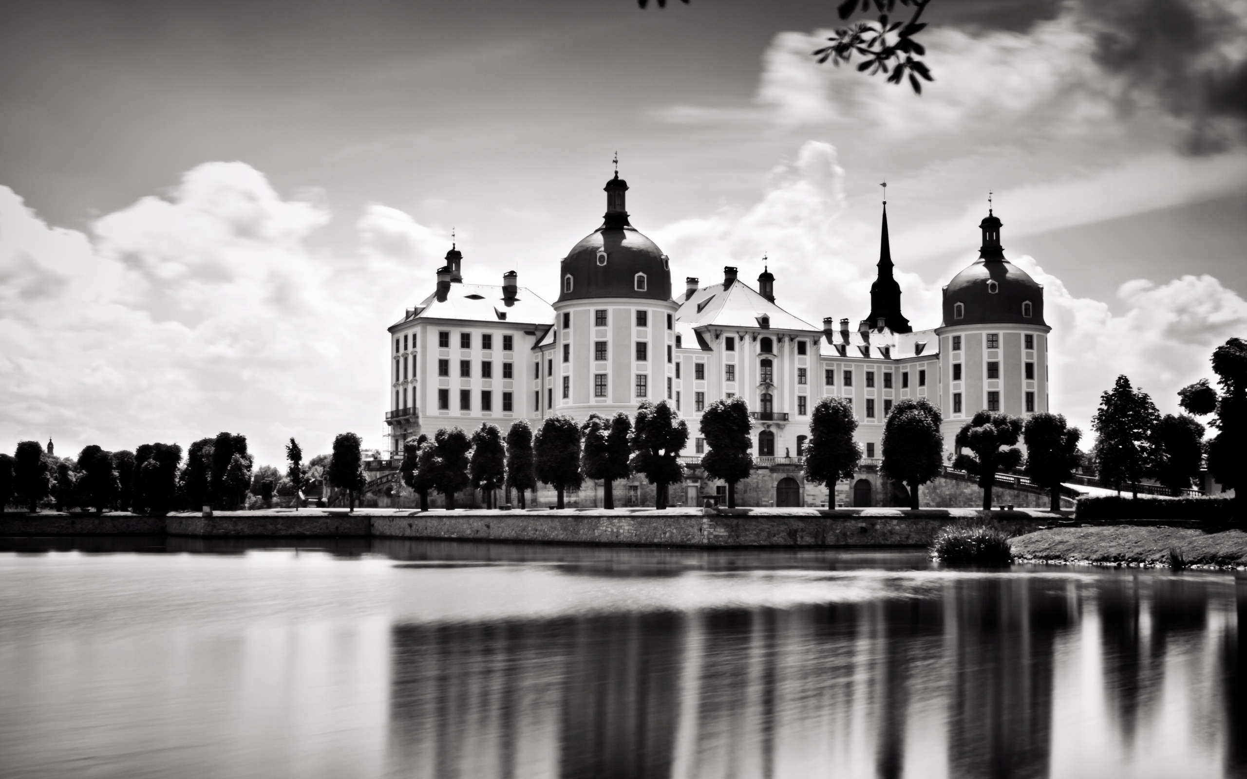 Description: A large building with a clock tower on top of it's roof next to a lake and trees.