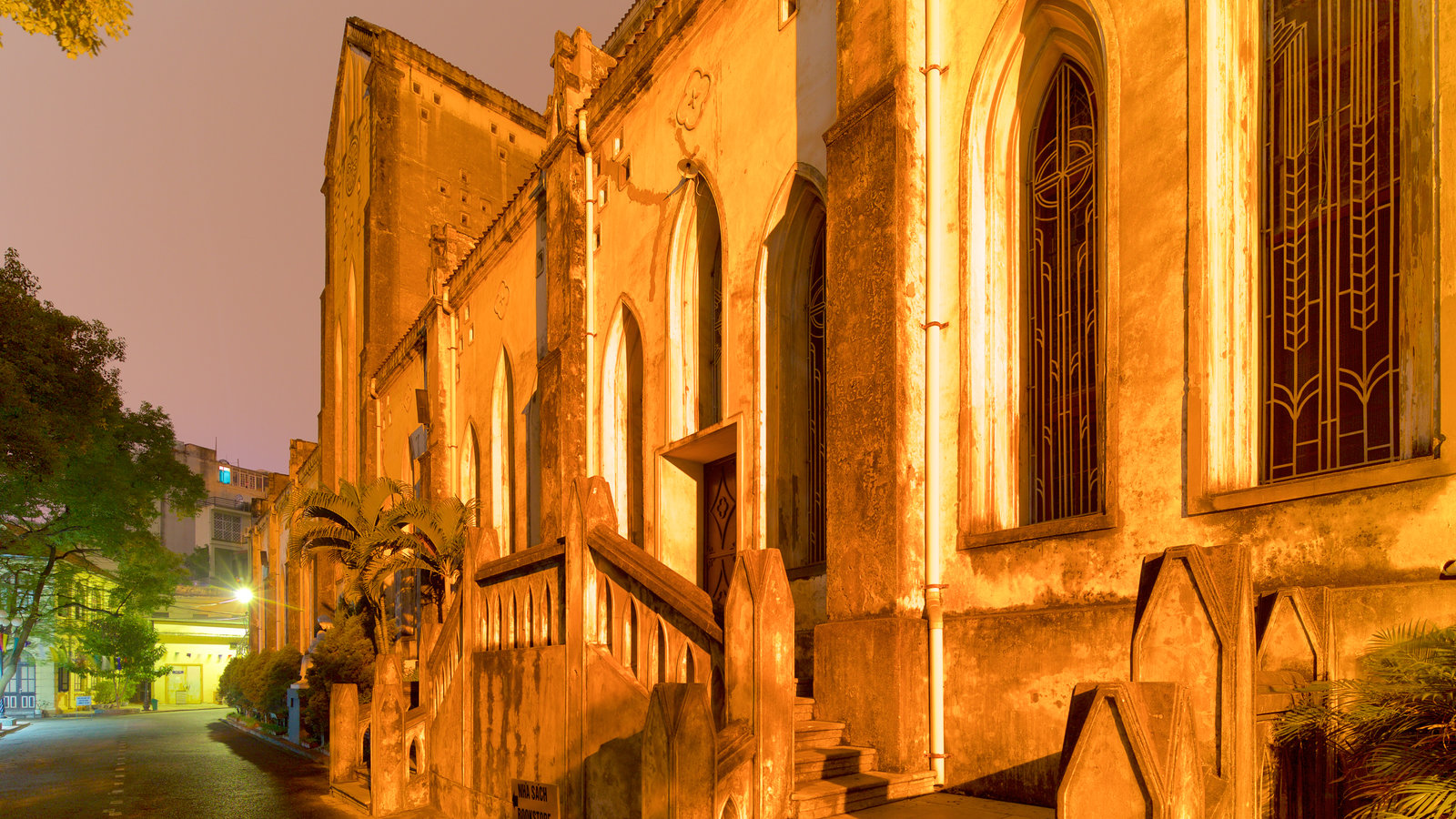 Description: A building with a clock on the front of it at night time with a street light in the background.