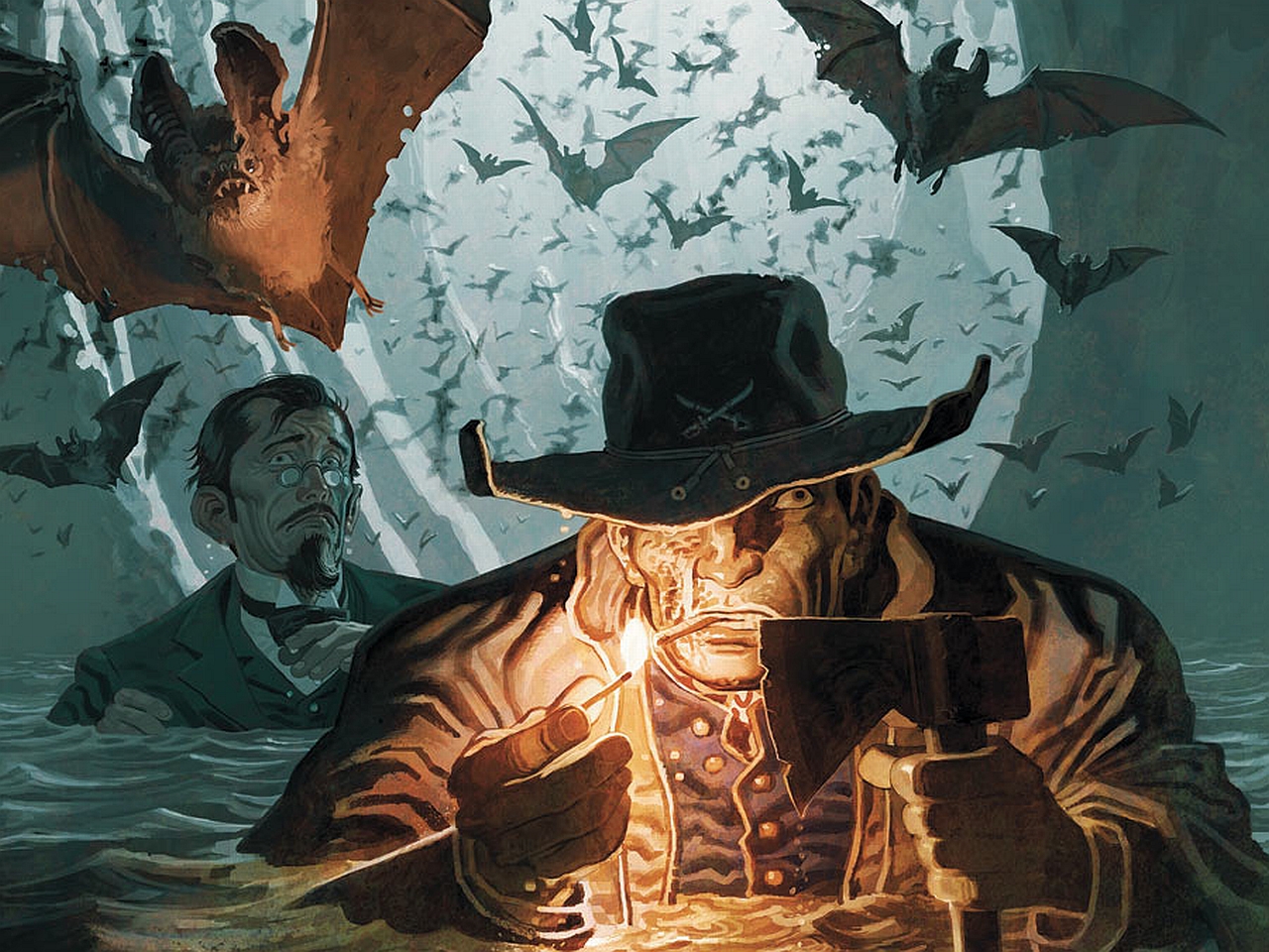 Description: A man in a hat and a bat flying over him and a bat flying over him and a bat flying over him.