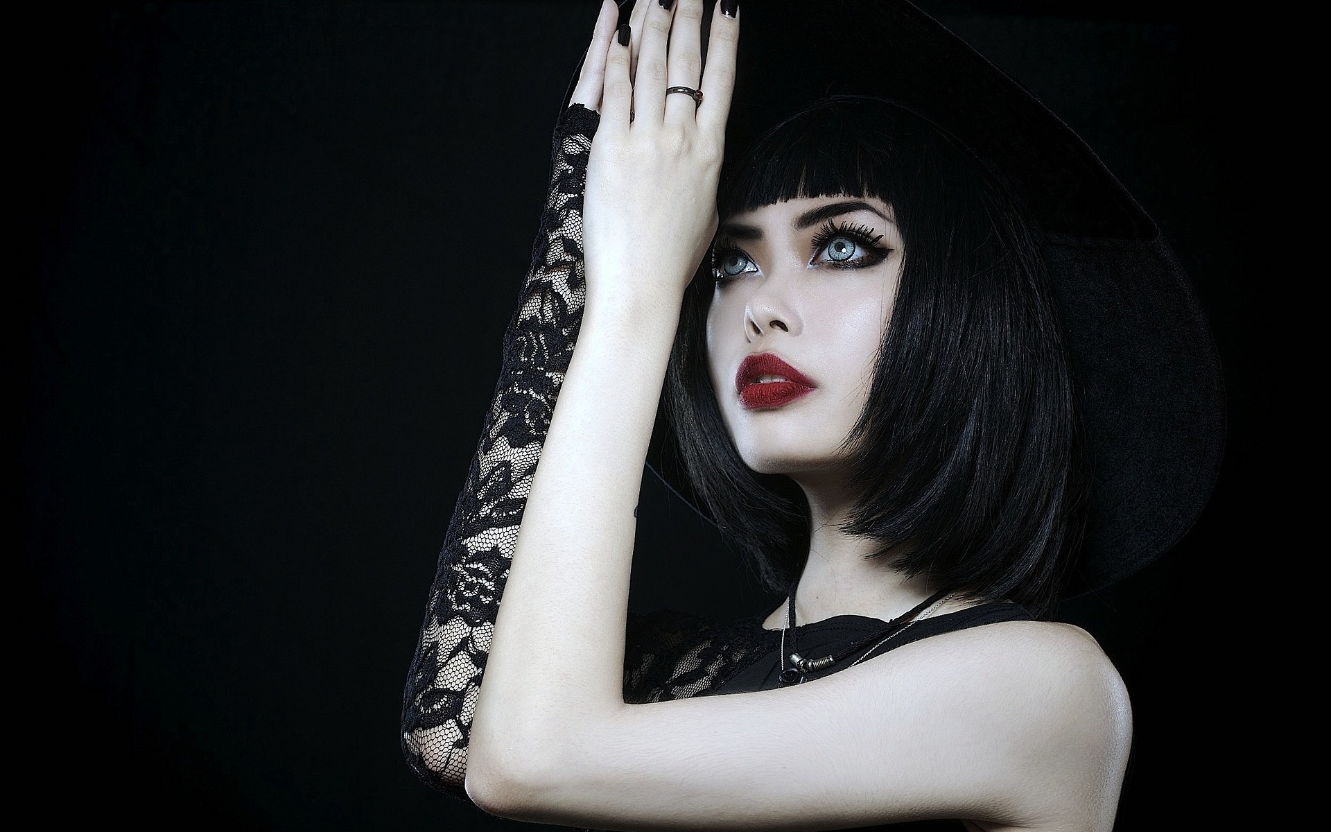 Description: A woman with a black hat and black dress and a black lace sleeveless top and black gloves and a black background.
