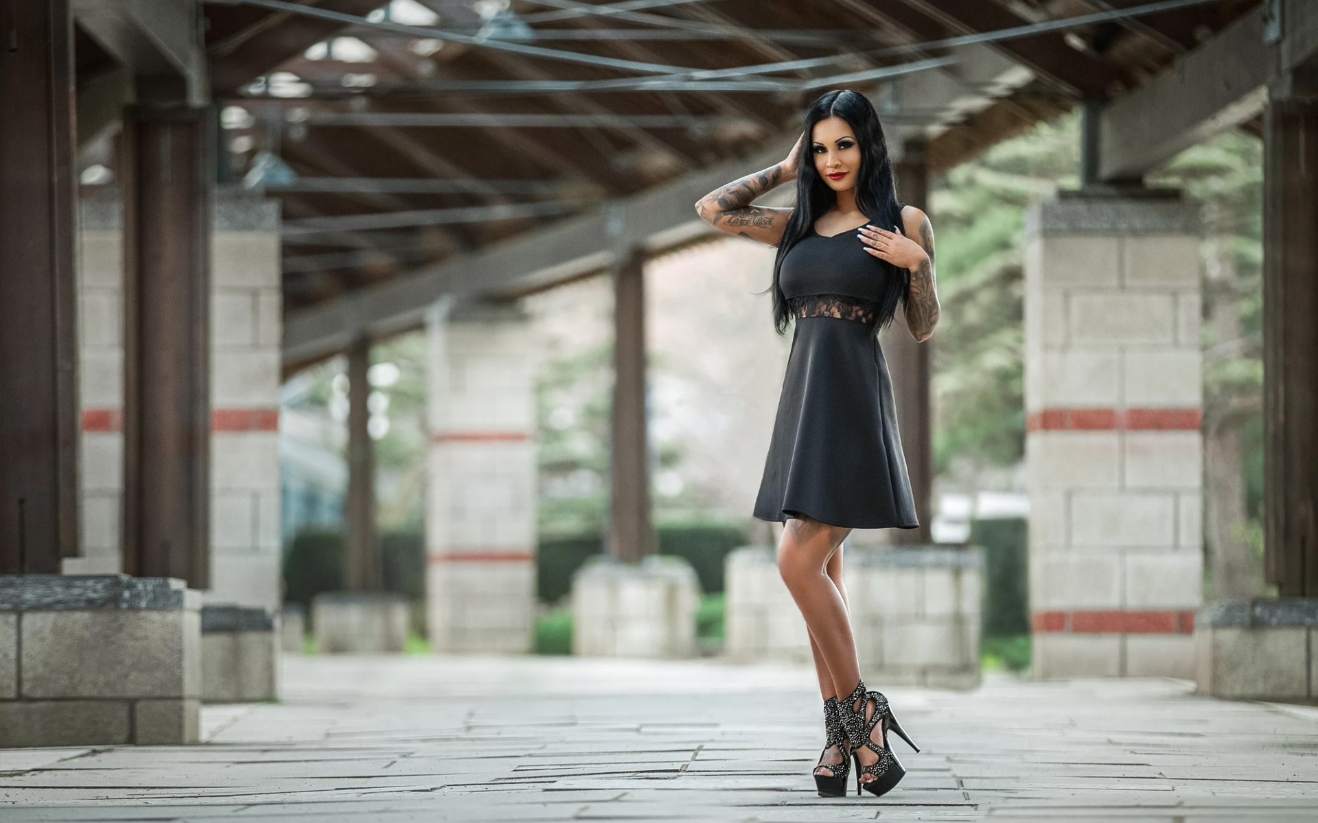 Description: A woman in a black dress posing for a picture in a building with a long black hair and a black top.