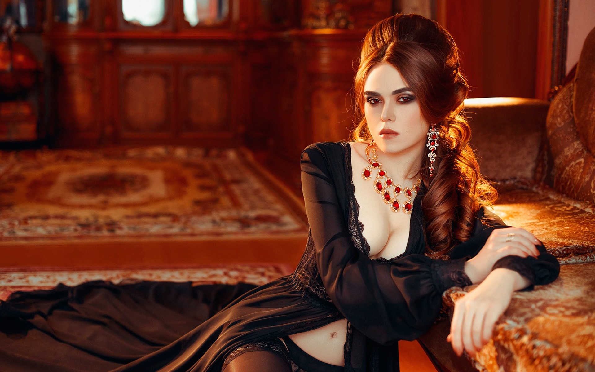 Description: A woman in a black dress sitting on a couch with a red necklace on her neck and a red necklace on her neck.