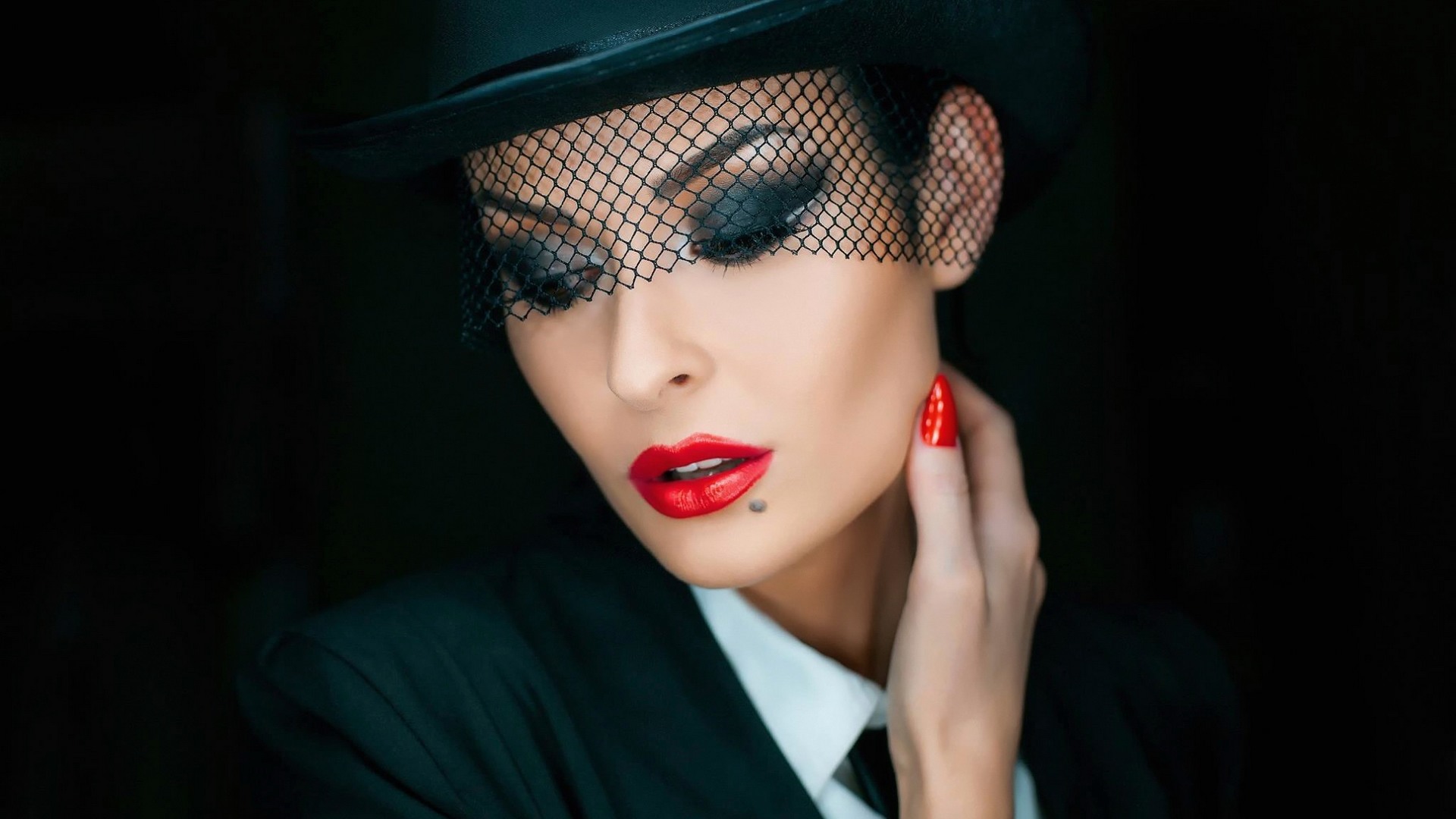 Description: A woman with a black hat and red lipstick wearing a black outfit and a black veil over her head.